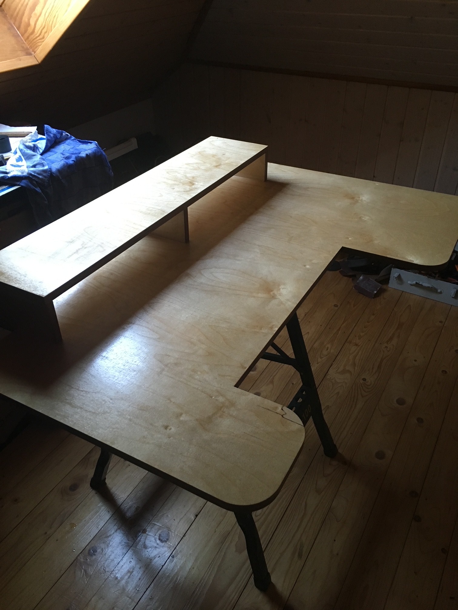 Leave some room to reach the switch and cables. I found the right angle by putting the boxes on the flank, and draw the shape of the stand directly on the wood.