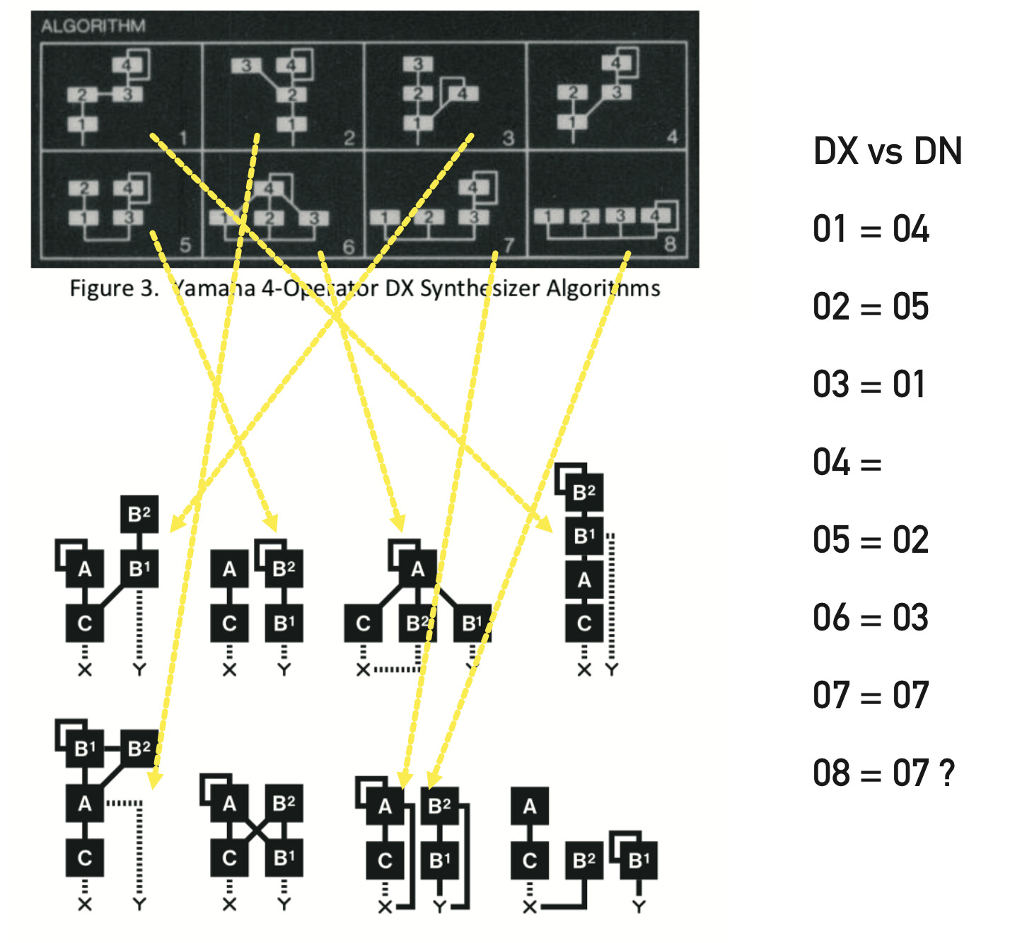 The way I read DN algo 7 is that it can do exactly what DX algo 8 is doing. Mainly it’s just additive synthesis of four operators without any FM happening. Algo 7 can do the very same, right?
