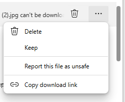 So if you go into your download dropdown at the top of the browser and it says something like “can’t be downloaded securely”, then you click on the three dots to the right you get this: