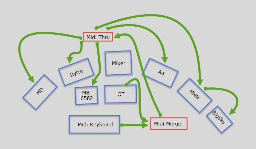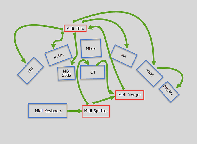 Currently I’m using a combination of a midi merger and a 1-in 5-out midi thru box to route midi from my OT (as master) and a Axiom49 (as controller) to a MD, Rytm, Mnm, A4, and MB-6582.