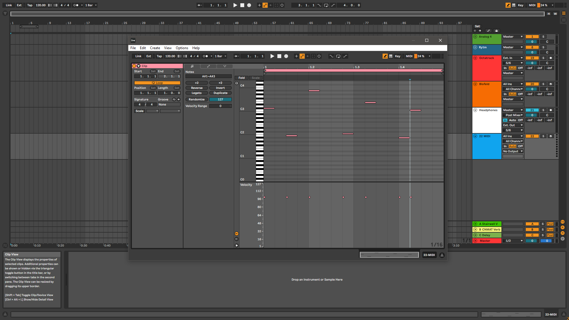 Each drum pad (as in, BD, CP, etc…) has a dedicated MIDI channel on the RYTM - mine are setup 1-12, for instance. This permits them to play chromatically (if the pad sound is set up for that). So I have (up to) 12 tracks in Live, under a Drum Bus group, which each have a pattern (in Ableton-speak, a clip) for that specific drum. This spits out the MIDI for that drum part, the collective whole are all routed to the RYTM, which then makes the appropriate noises and that gets sent back as audio via the direct outs to a receiving audio track. I don’t usually use the choke groups as separate drums, so single-tracking both of those is fine, and occasionally I’ll use the global channel’s non-chromatic trigger region (the lowest octave) to put a combined pattern down for any/all pads (though in reality this is usually used just for the open and closed HH choke group to make writing that part easier).