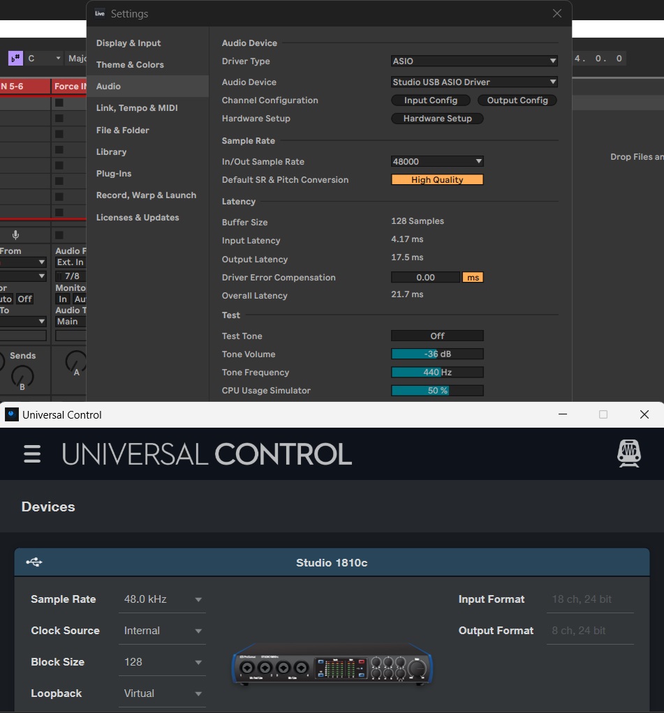 If you open the control panel for the driver itself, does it have its own latency performance settings like “Safe”, “Fastest”, etc.? It could be that the driver control panel is changing things to a “Safe” setting and increasing latency even though the sample rate and bit depth don’t change.