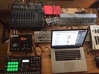 So my setup consists of several synthesizers and drum machines running into a mixer, then the output of the mixer running into the Heat, then the output of the Heat running into a Scarlett 2i4. The Scarlett 2i4 USB is running into my laptop. The Heat is also connected to my laptop via USB connection.
