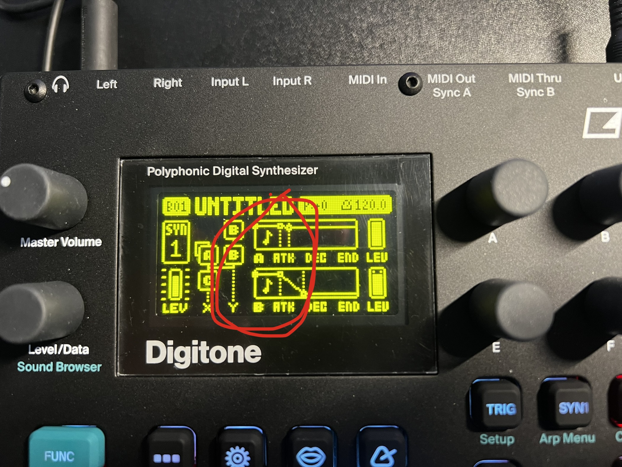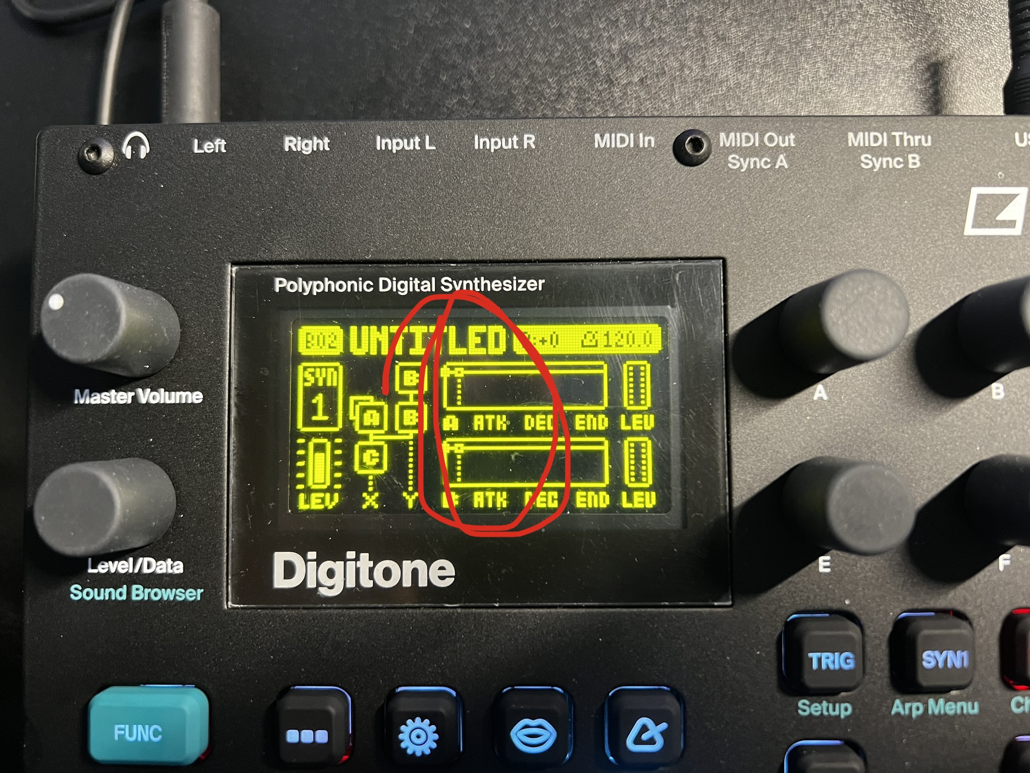 Syn2, Second page, envelope delay. Its in the manual.