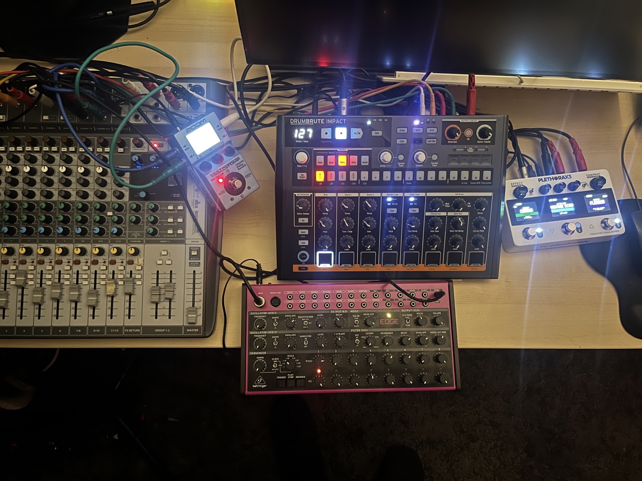 Anyway, first I wanted to only use the Drumbrute Impact + Mixer + FX, but I was missing some “random but tweakable bleeps and bloops”. (The 101 & 303 sounded overdone, the Korg Drum too pre-programmed & fiddely).