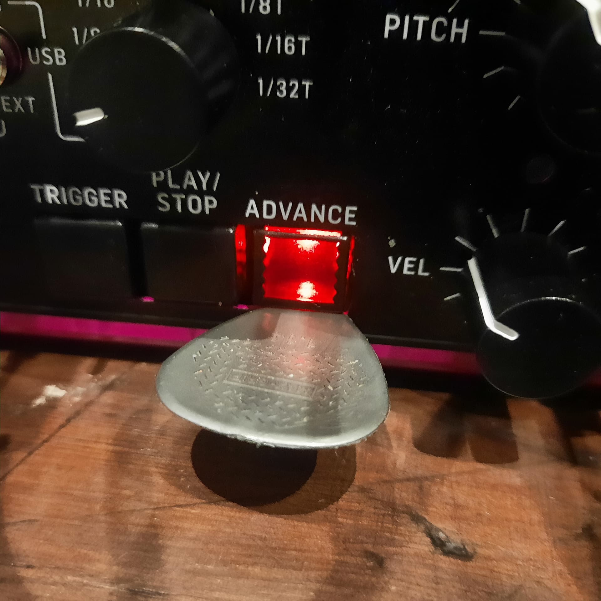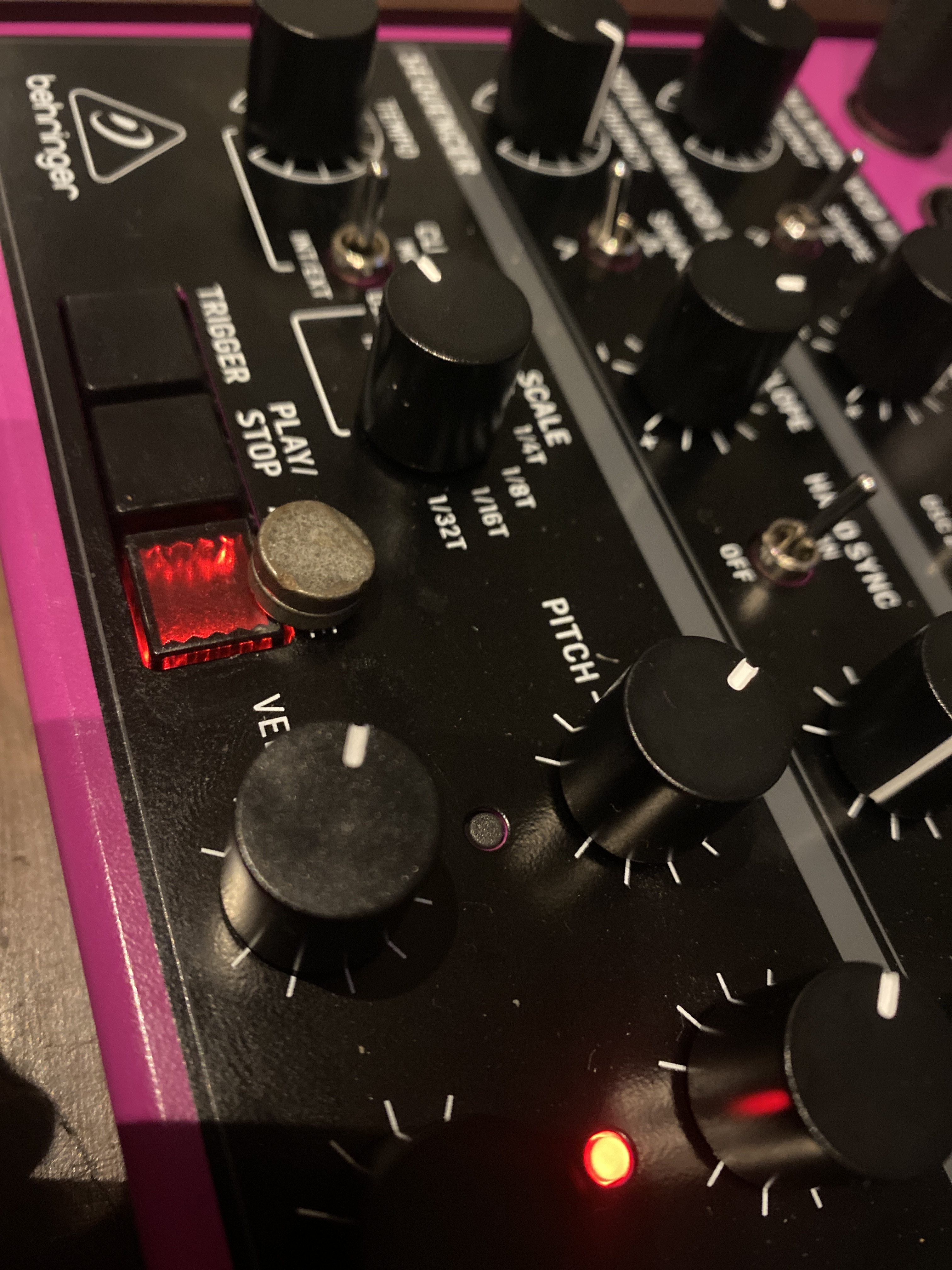 They’re a little smaller than the stock knobs, which I consider an improvement, as I found the factory set to be pretty crowded, and they’re pleasant to touch and much easier to work with for my hands. The magenta knobs are an improbably close match for the Edge’s paint job (see my FM AMT knob). They’re quite snug - I wouldn’t want to subject the poor PCB to several rounds of installation and removal. They leave about 1 mm of breathing room when they’re fully seated, although they’re more or less grazing the surface on the very top row of my unit, which makes me wonder if the the board wasn’t installed with a very subtle tilt.