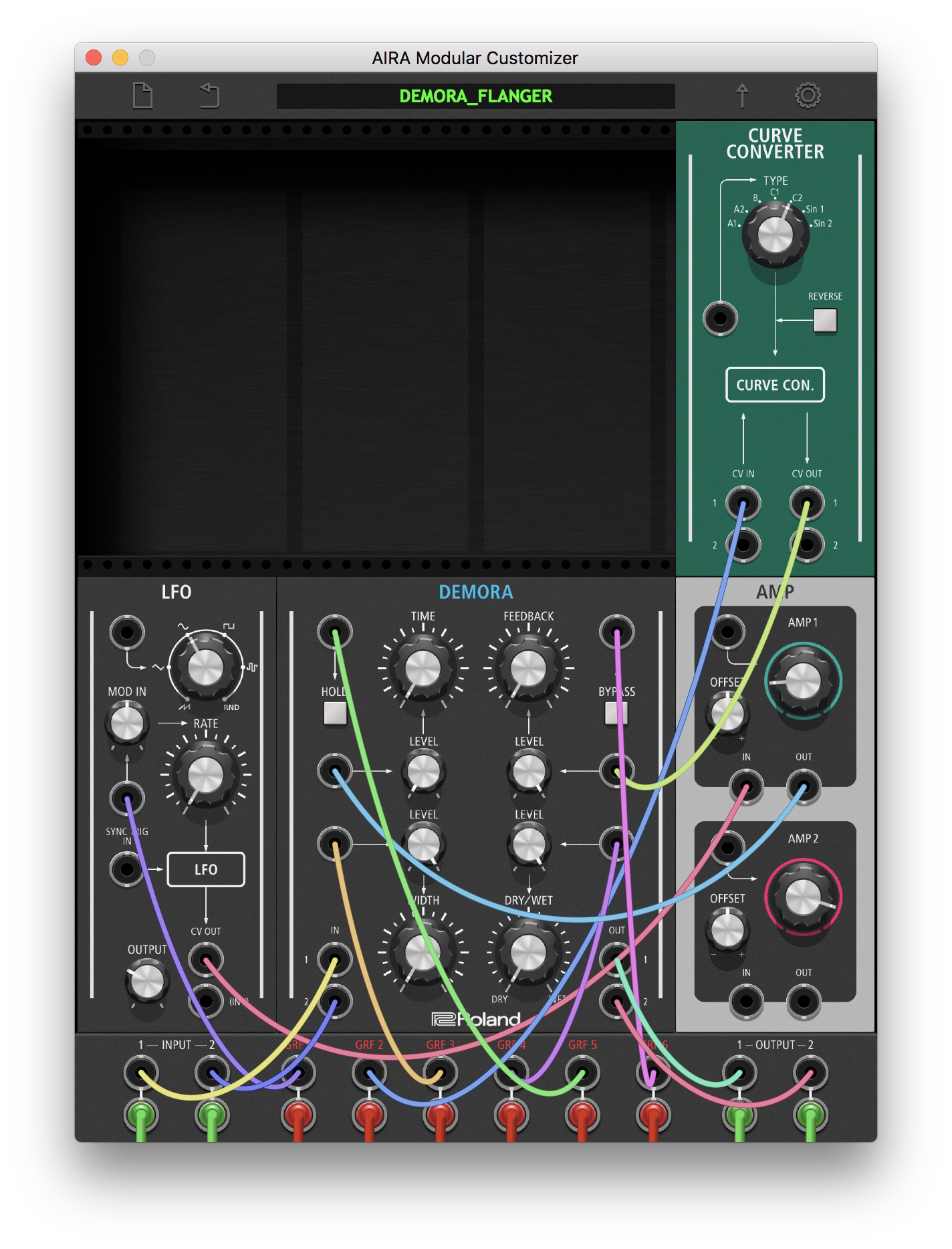 Hats from a basic 808 kit on the TR-8S, first dry, then running through the eight different flanger types on the MX-1 mixer master fx. Then I turn that off and bring the kick & snare in (they’re not going through any effects, obviously) for a bit more fun and activate the Demora. The Demora has the stock “Demora Flanger” preset loaded from the Aira modular customizer library: