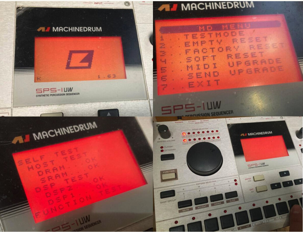 thanks for your questions. ① Press the play button after startup → No change (remains a black screen, does not play, LED does not light up) ② Unplug and plug the power, start while pressing the play button → The logo and “K 1.63” appear at 0.5 second intervals It becomes like this. However, the situation remains the same and there is no change. ③ Unplug and plug the power, start up while holding down TRIG1 → Same state as ② ④ In addition to steps ③, press the FUNCTION button several times → “MD MENU” screen appears. I selected TESTMODE (TRIG1) and was able to transition to the “SELF TEST” screen. When I press the button, the LED lights up, but there is no sound and there is no LED regularity. ⑤ Press FACTORY RESET (TRIG3) from “MD MENU” in step ④ → Return to ② and there is no change. *The backlight is always on from ① to ⑤.