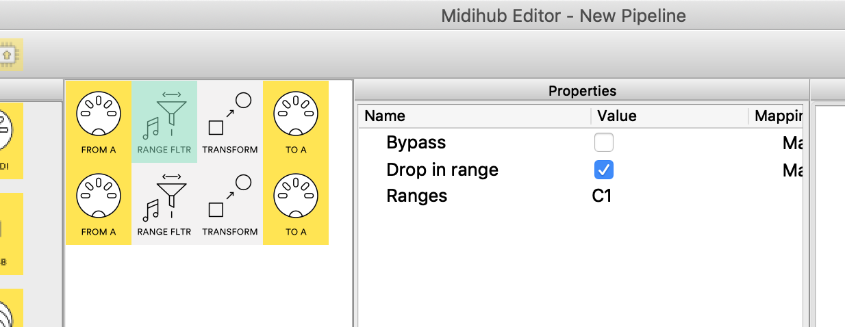 and then the other pipe is for the corresponding un-mute (CC94 with value 1 from note D1). I’d need to translate from one midi channel to the corresponding one for both still… one thing I’m curious of: the first pipe that only allows C1 through, that wouldn’t exclude D1 then for the other pipe? meaning, are they processed in series or basically just a set of rules?