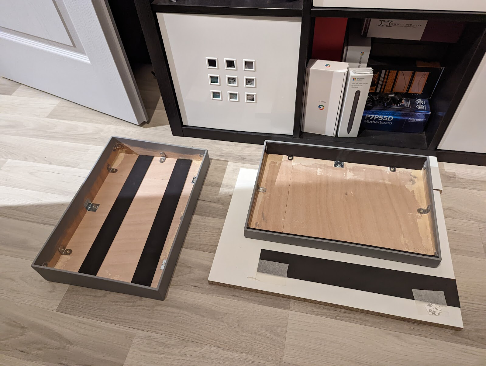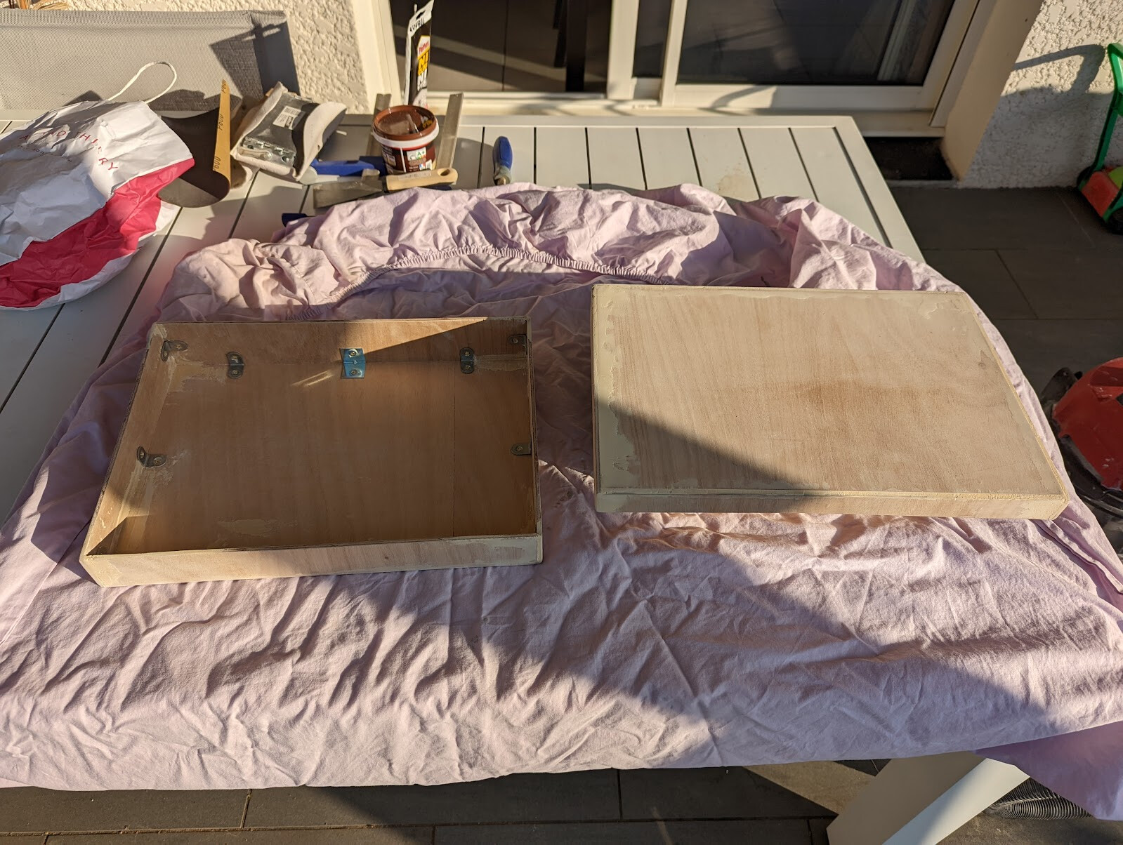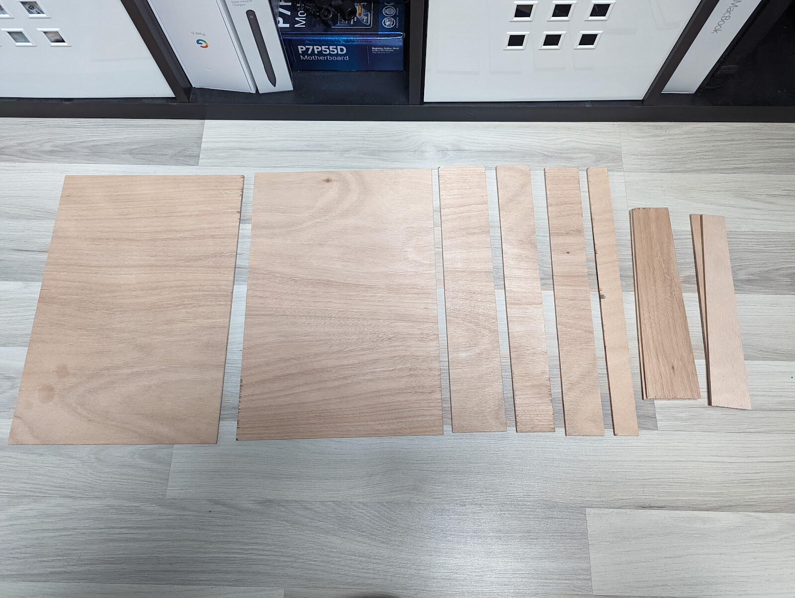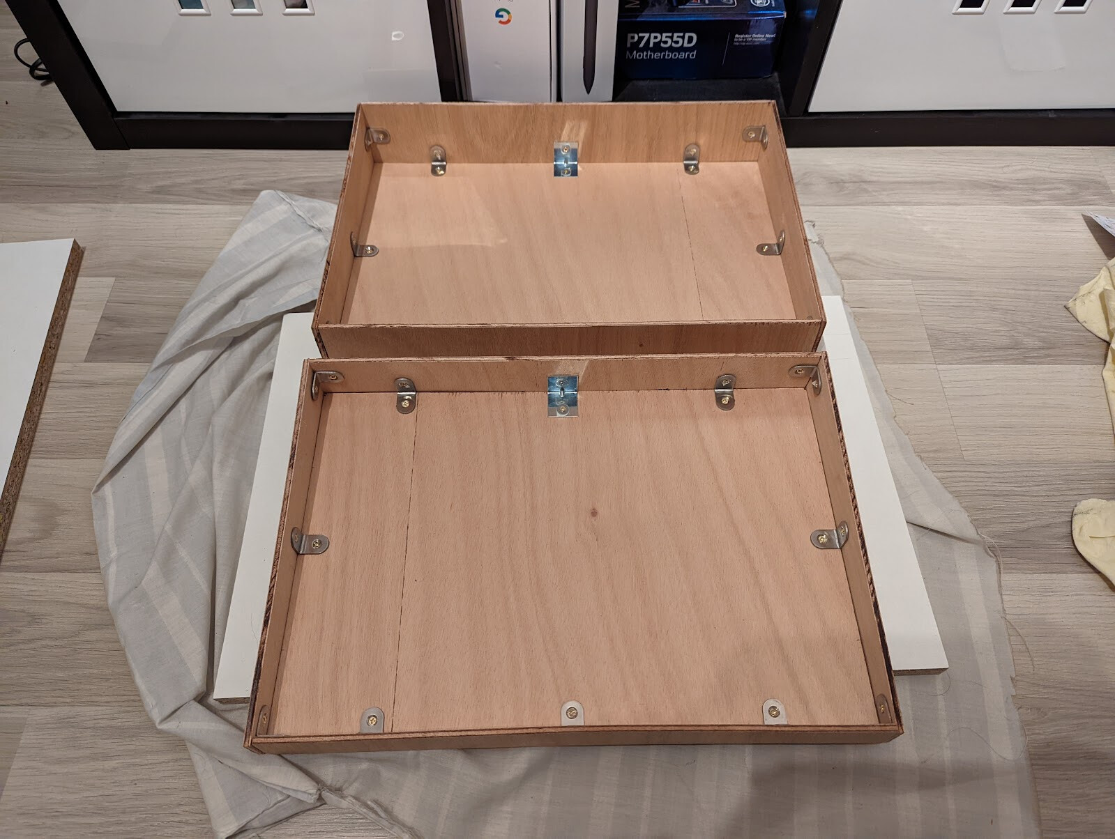First mistake: turns out plywood is extremely difficult to cut cleanly without the appropriate tools (which I didn’t have). Second (dumb) mistake: 5mm is too thin to be able to screw inside the panels, I had to search hard for 5mm length screws that would not end up piercing the wood when putting the holding metal plates. Would definitely use 8mm next time for a simpler build!