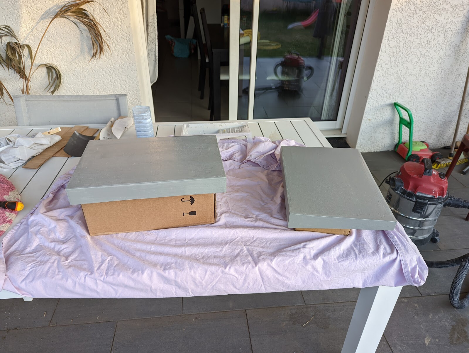 To try to make a better finish and make the boxes a bit sturdier, I added some wood paste in all corners and holes. This was a pain in the a** to sand manually!