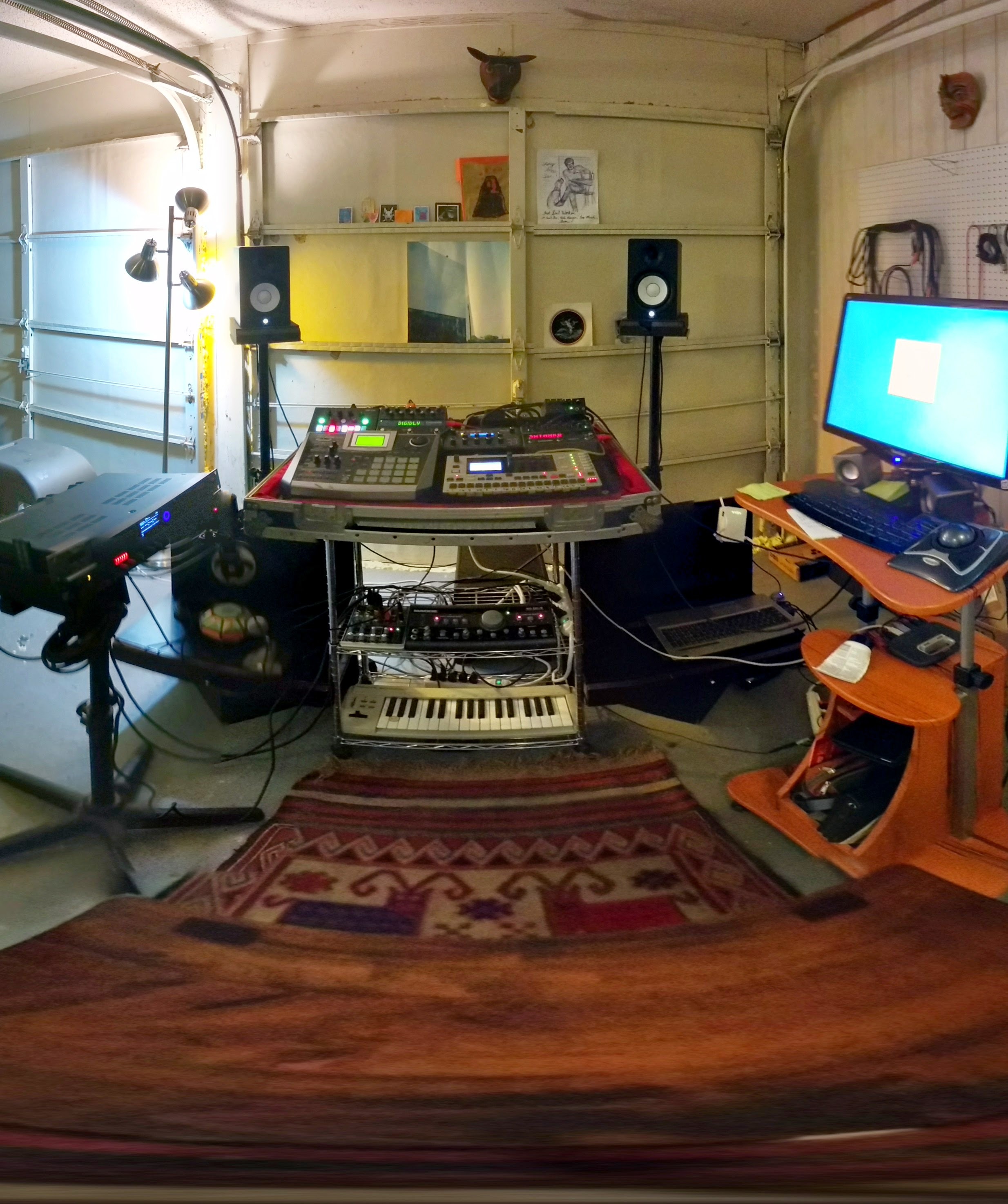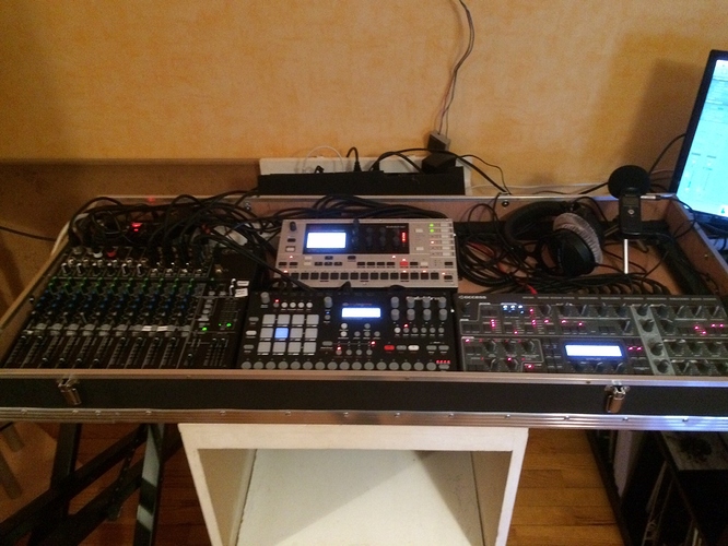 i made a flight case in witch i put mackie 1402 vlz3 on the left, analog rytm just next to it, my virus ti desktopon the right, behind is the monomachine and all the psu and audio cables, all stay plugged in the mackie and only the L andR and one cable for powering go outside the flight, it costed me around 80€ to build it with wood paint etc…