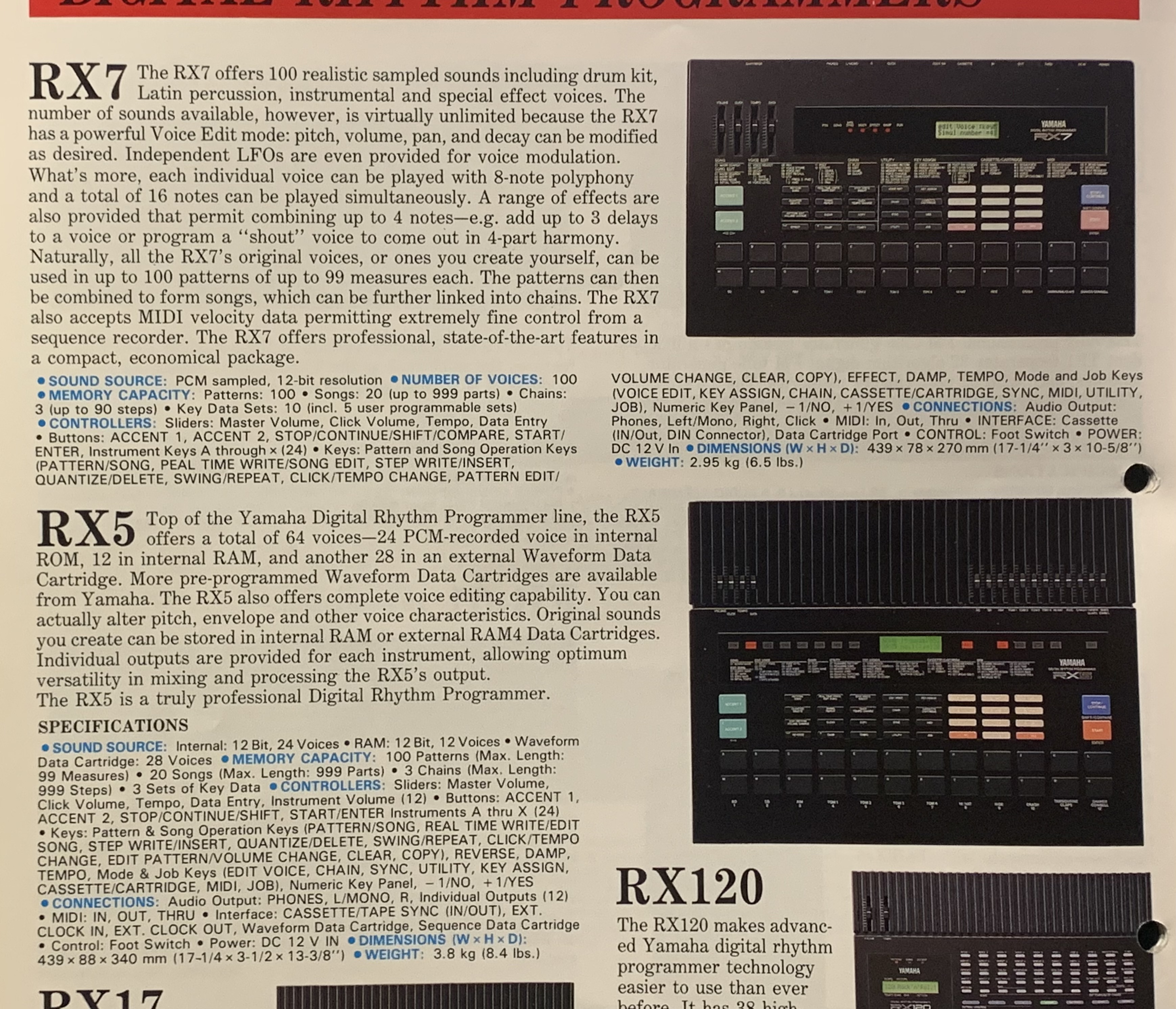 If the separate outs aren’t crucial, I’d recommend finding an RX-7 instead. It has 3-4 times the sounds built in (many excellent ones) that you would otherwise need several cartridges to obtain on the RX-5. 100 built in sounds iirc. Apart from the outs, faders and the sounds they’re basically the same machine.