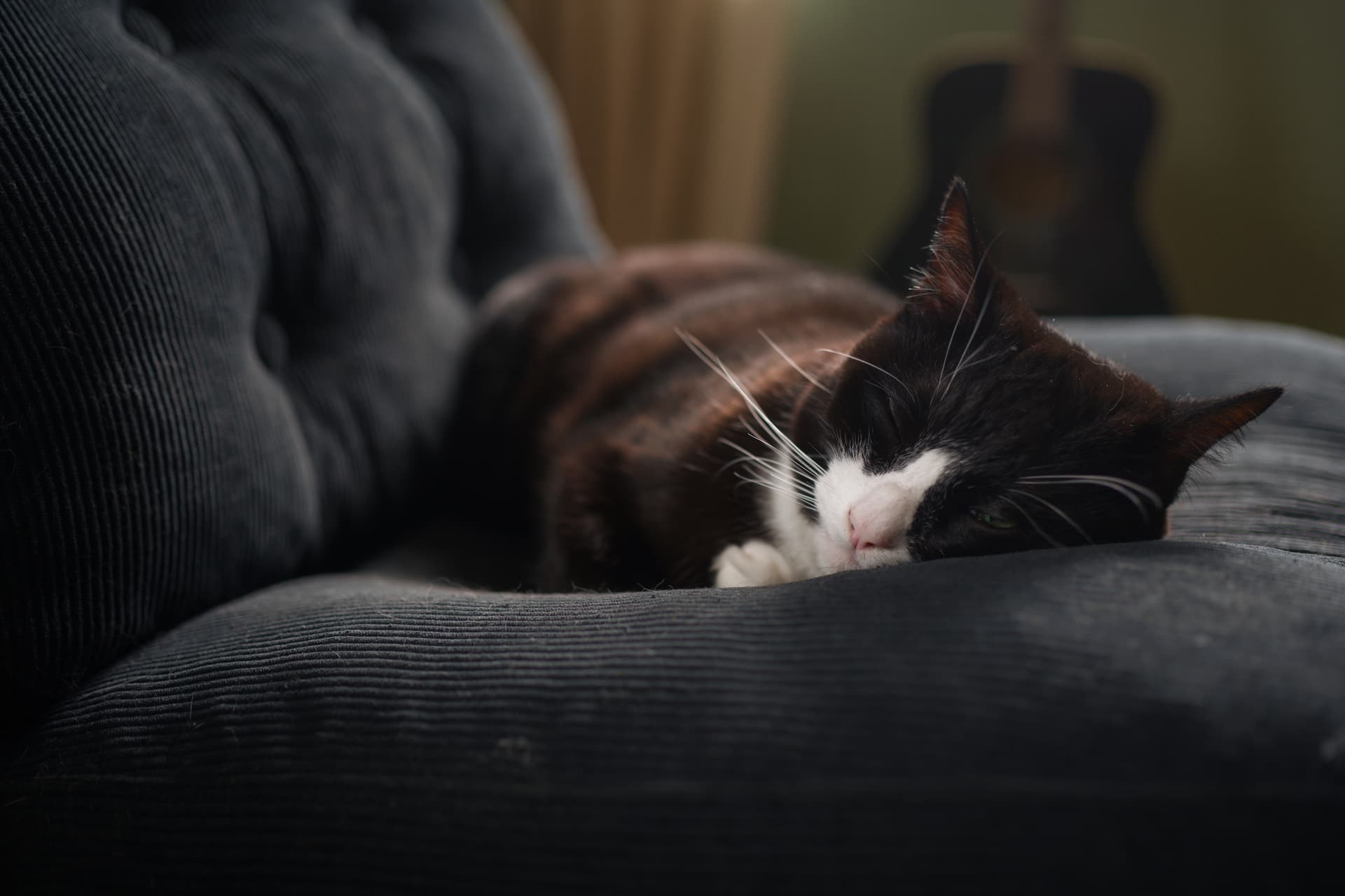 Camera says it was 140mm - but the difference to 85mm isn’t that drastic in reality. For comparison, here’s a lazy cat at 35mm: