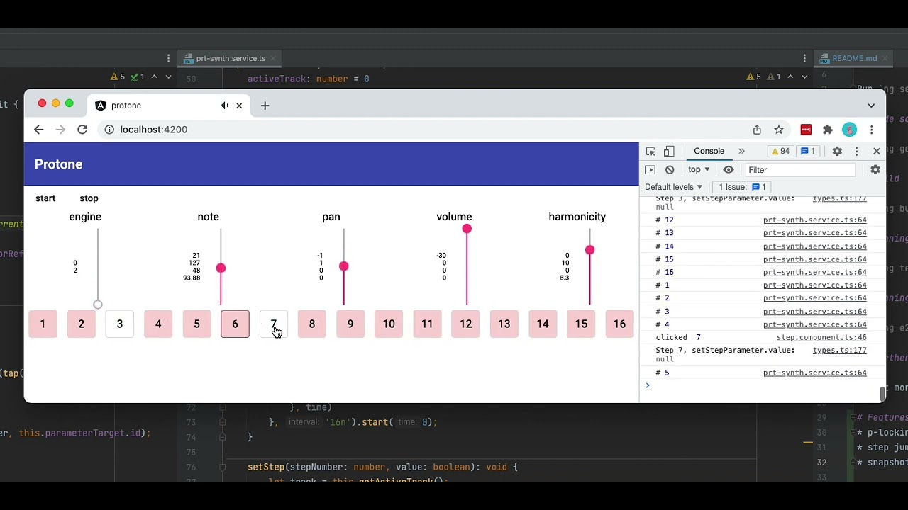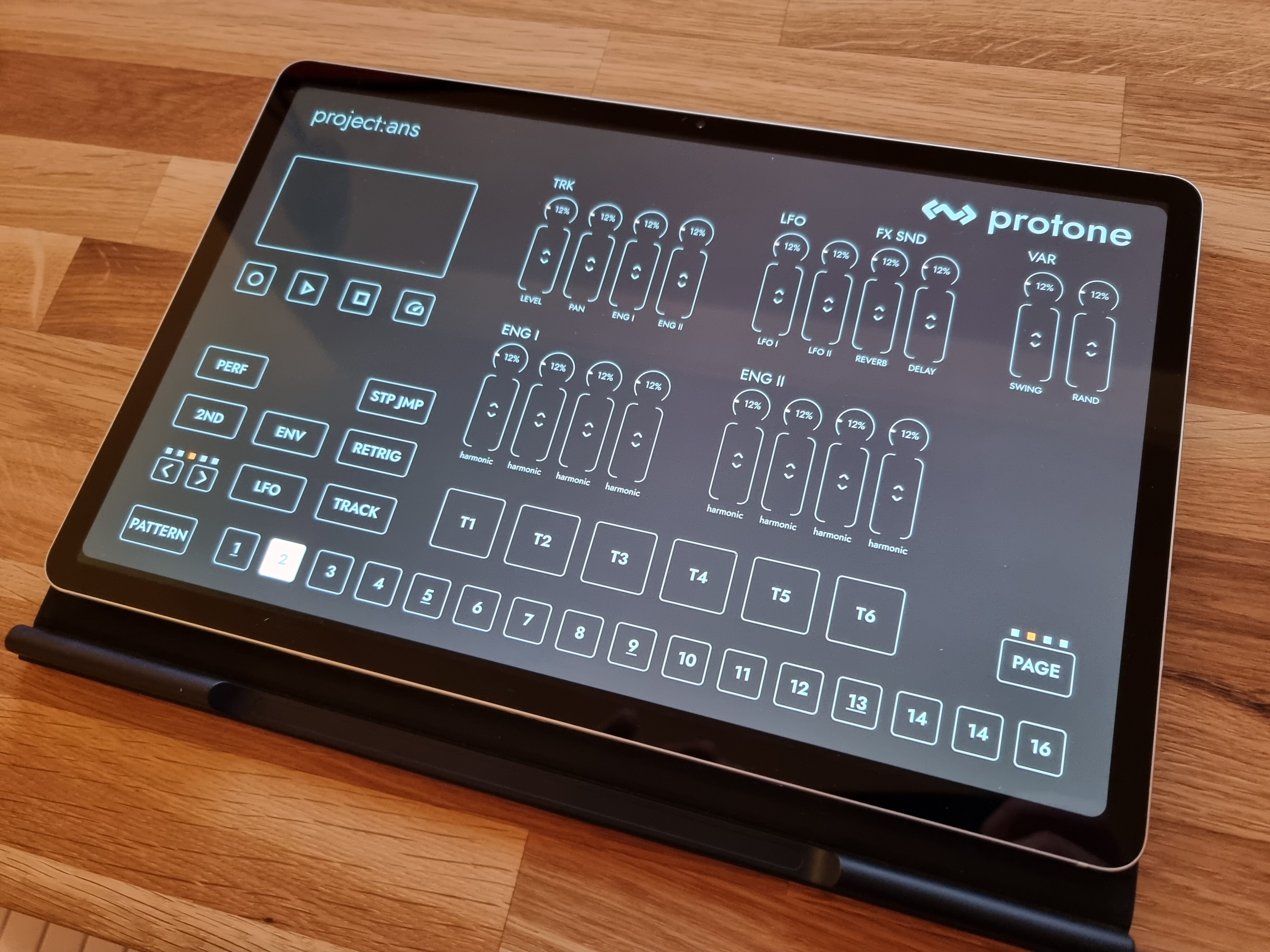 - each track has one “engine” (like a specfic tone.js synth: AM, FM, Metallic, …)