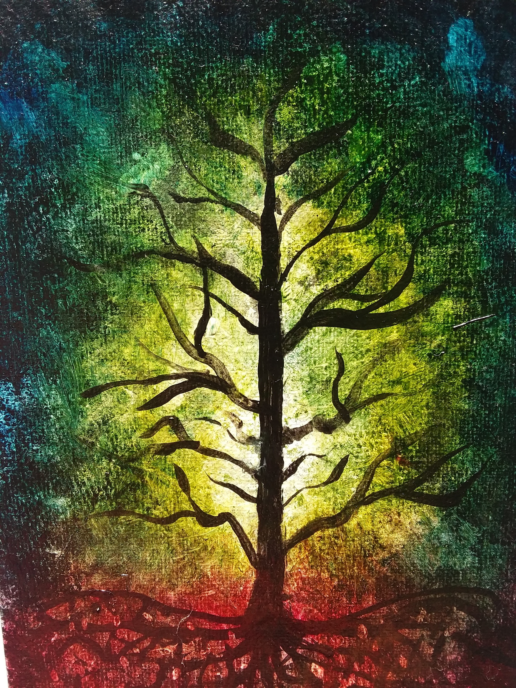 Just like music theory, in my mind. With painting, I haven’t a bit of formal training. I just took the inspiration from one of Bob Ross’s glazing techniques and went in my own weird direction. Now exploring concepts and symbology after the creative act.