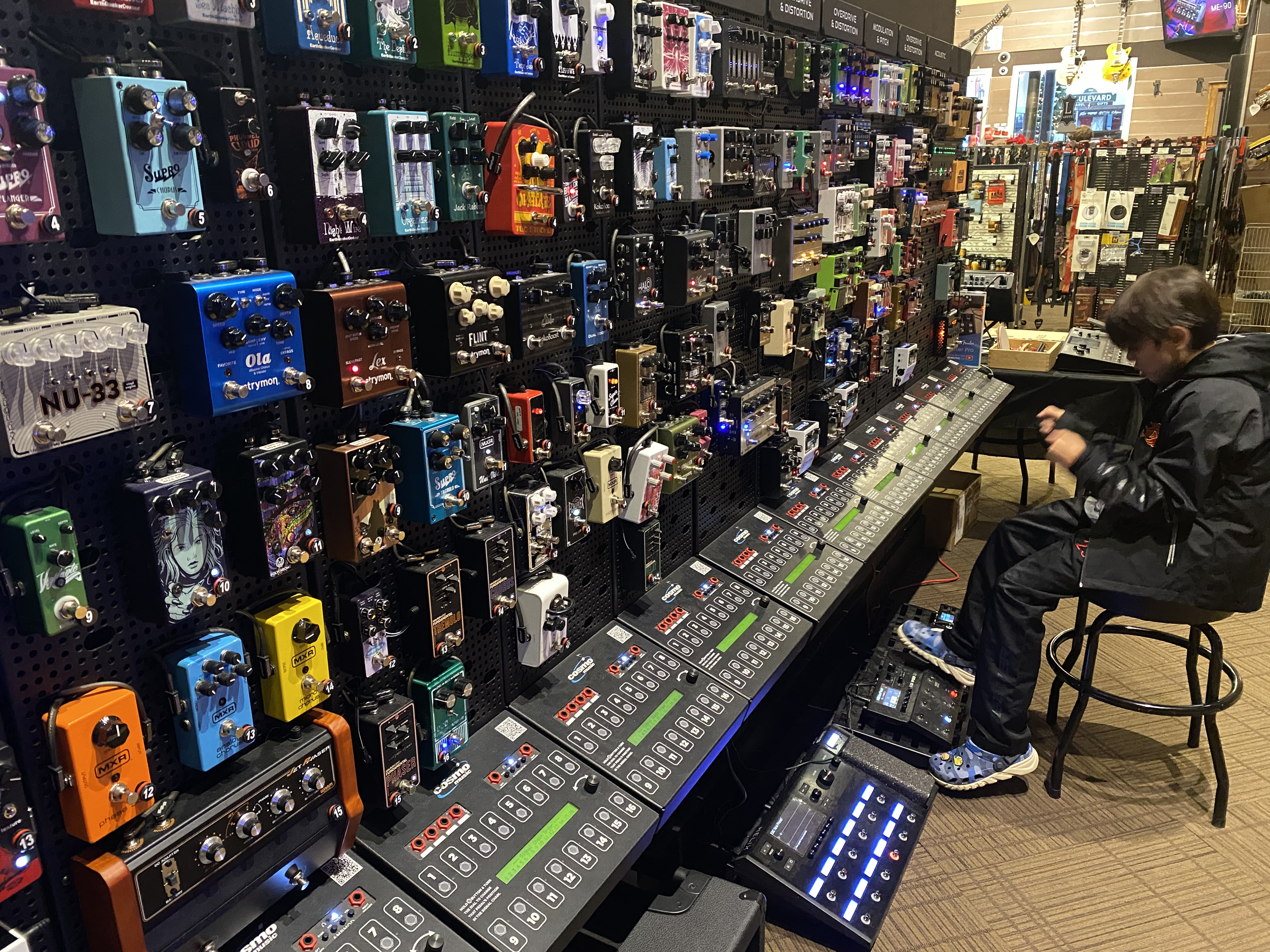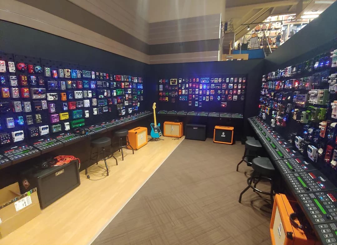 The original Cosmo was a much smaller store that wasn’t too far from where I grew up. I drove out to the new location a couple times, most recently last year. They had this area where all of their pedals were set up with a system where you could plug in and demo them. Very cool.