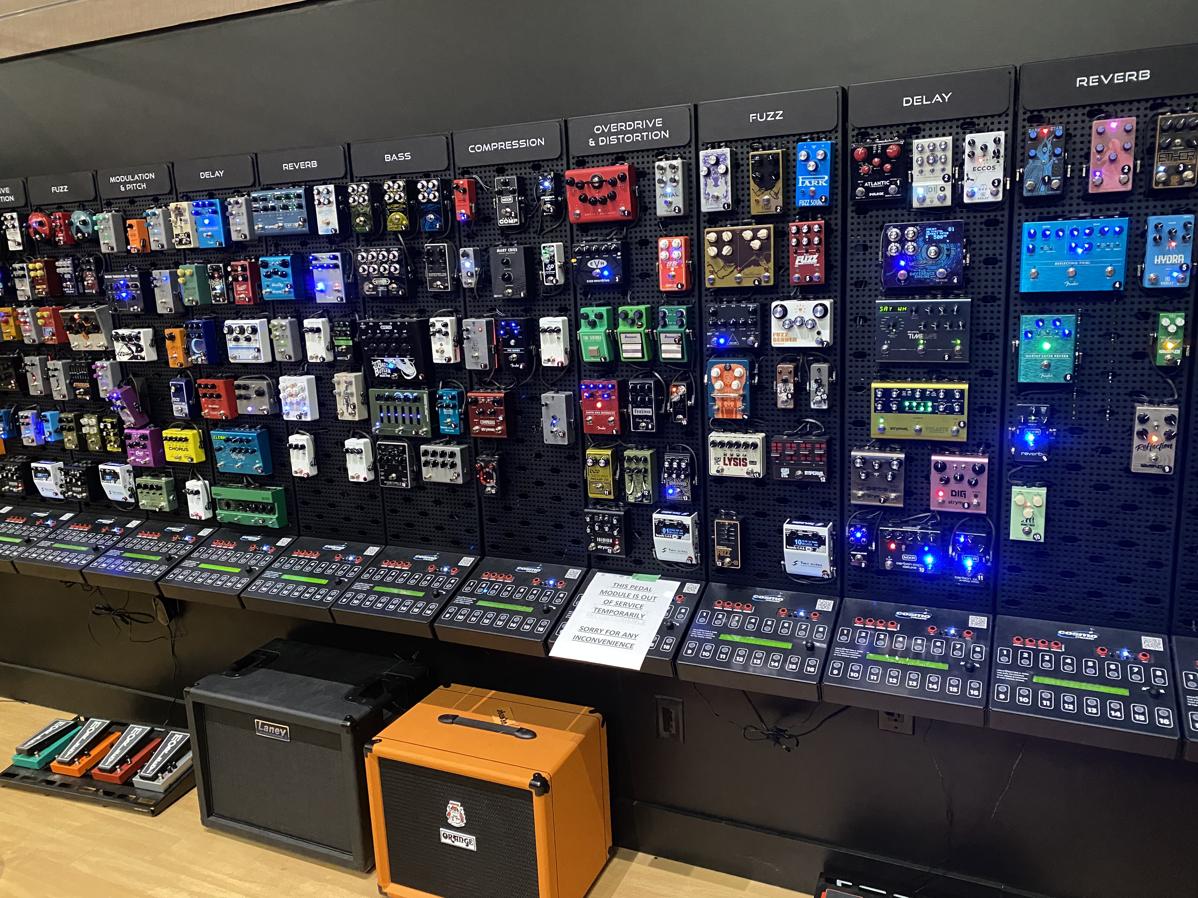 Sounds like they are selling off whatever they can, right down to the store fixtures and displays, so maybe some of this pedal wall gear is available too ! All the in-store demo equipment might be negotiable too.