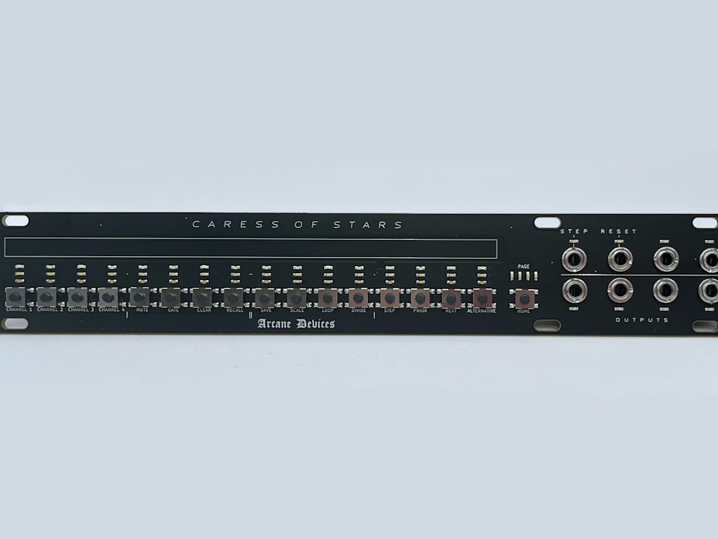 A 1U CV sequencer controller instrument with a touch strip and sequence buttons and LEDs.