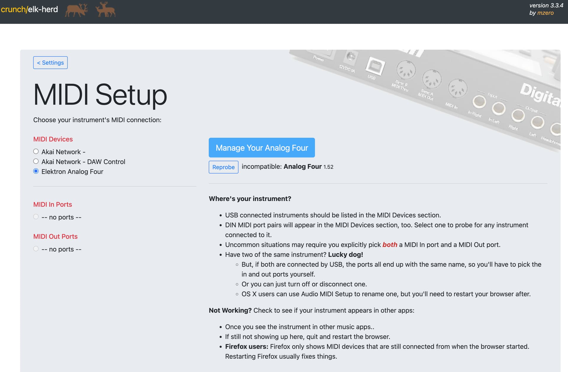 I have Crunch/elk-herd connected to my Analog Four mk1. It is recognised in the MIDI setup screen, but when I click Manage Your Analog Four it doesn’t go ahead. I can use my Digitakt 1 and 2 without any issues.