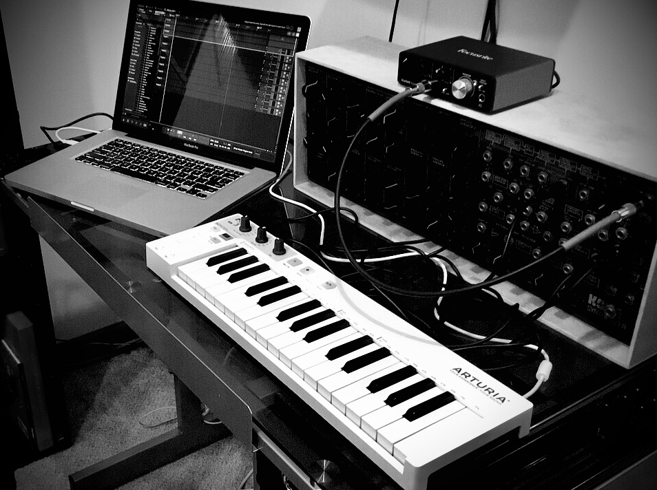 Technically, it’s not my gear, but Donovan’s. You can tell it’s his, on accounta the photo being black & white. His MkI Korg MS-20, to be specific, or the carcass thereof, after a bit of surgery and what can only be charitably referred to as ‘calibration’. To test it out, I fired up the free version of Tracktion’s Waveform 12 DAW and an old laptop, and connected a Keystep.