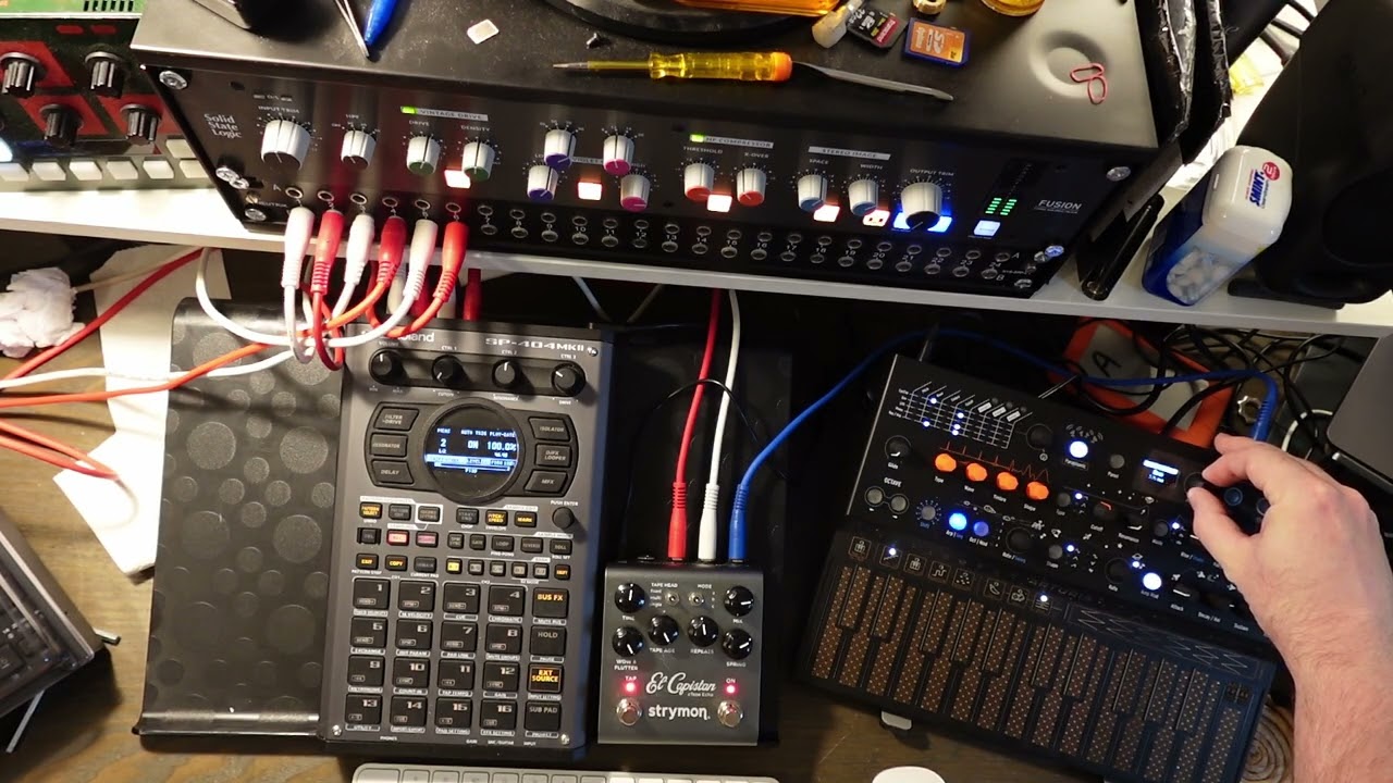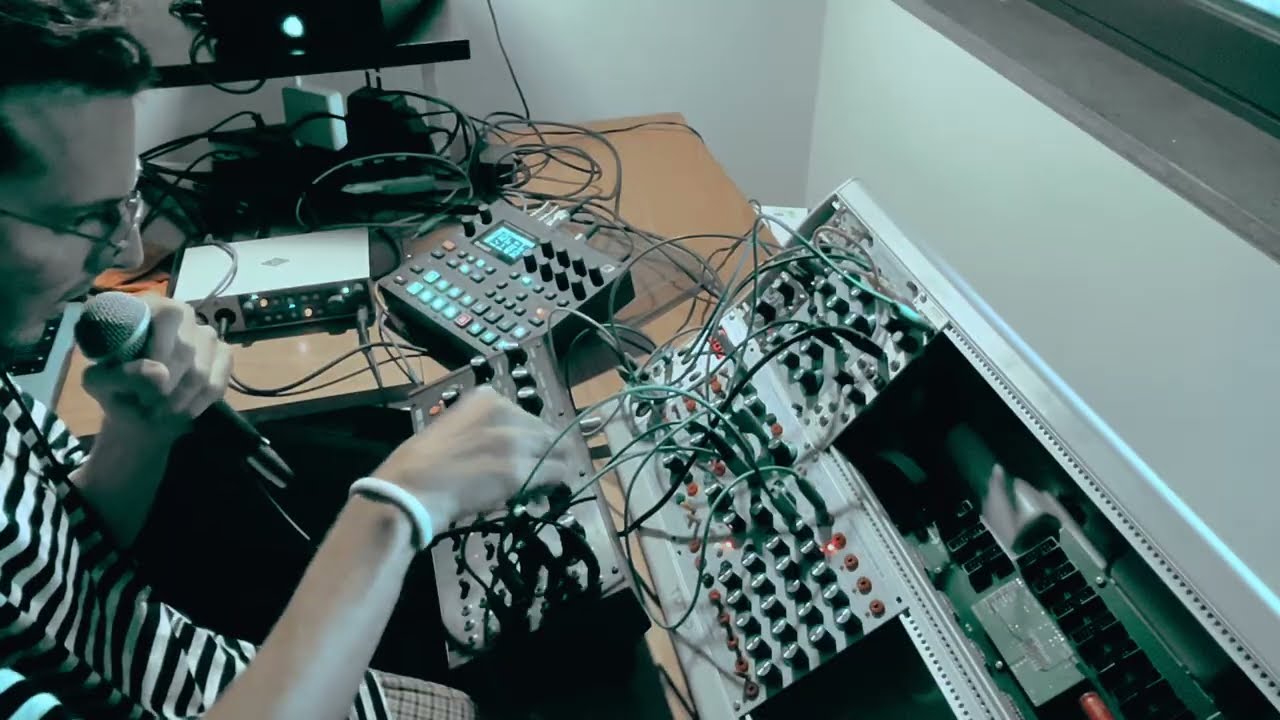 A short live session where the voice is routed through the Moog DFAM’s external input, processed inside the Elektron Syntakt, while the modular handles background modulation and textures.