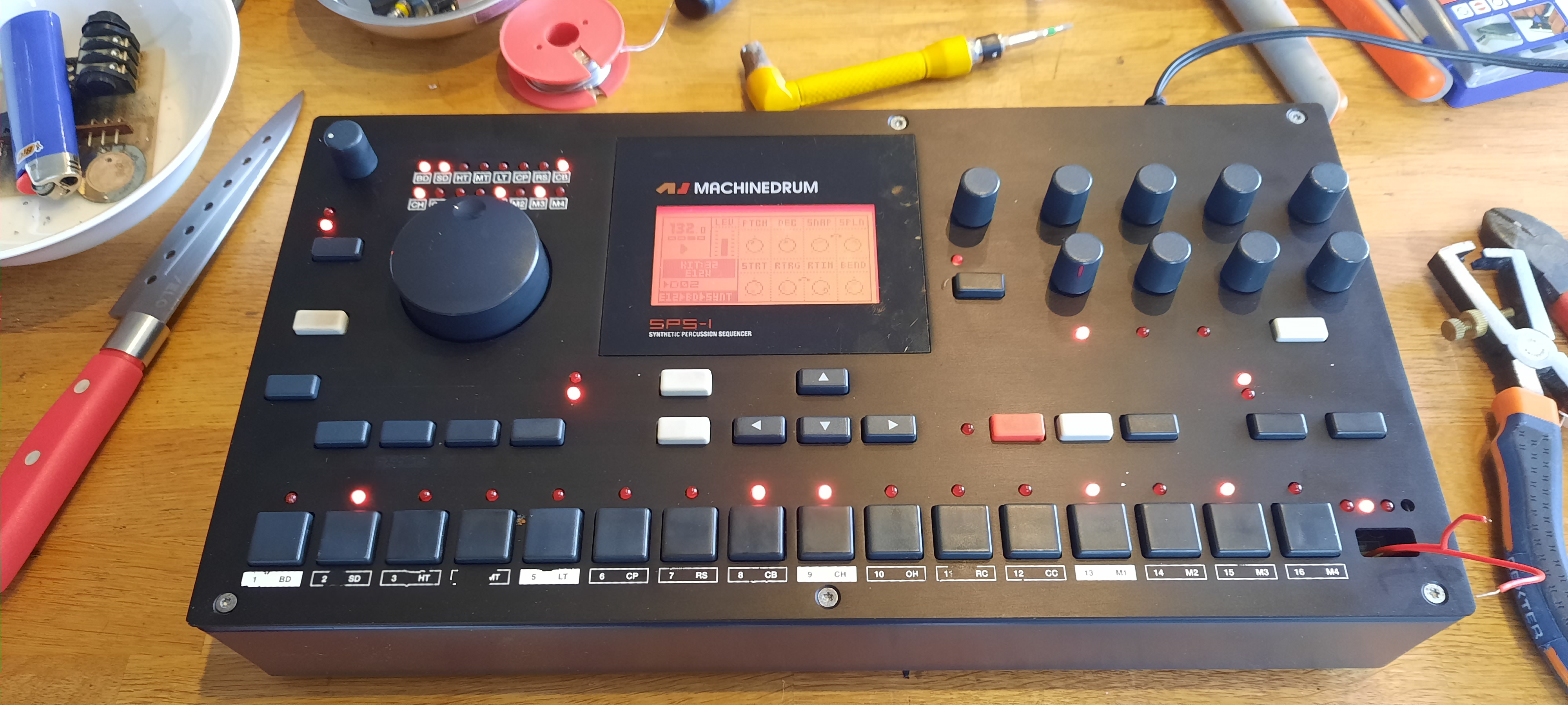-the custom knobs pictured above (the level, volume, and p-lock knobs in the picture are Dave Smith knobs and he is unable to do the big E main sound encoder wheel again)