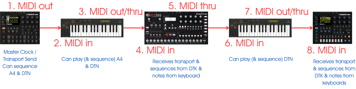 Digitakt as master clock/sequencer → MIDI out → MIDI in → keyboard → MIDI out (with ‘thru’ enabled) → MIDI in → A4 → MIDI thru → MIDI in → keyboard → MIDI out (with ‘thru’ enabled) → MIDI in → DTN