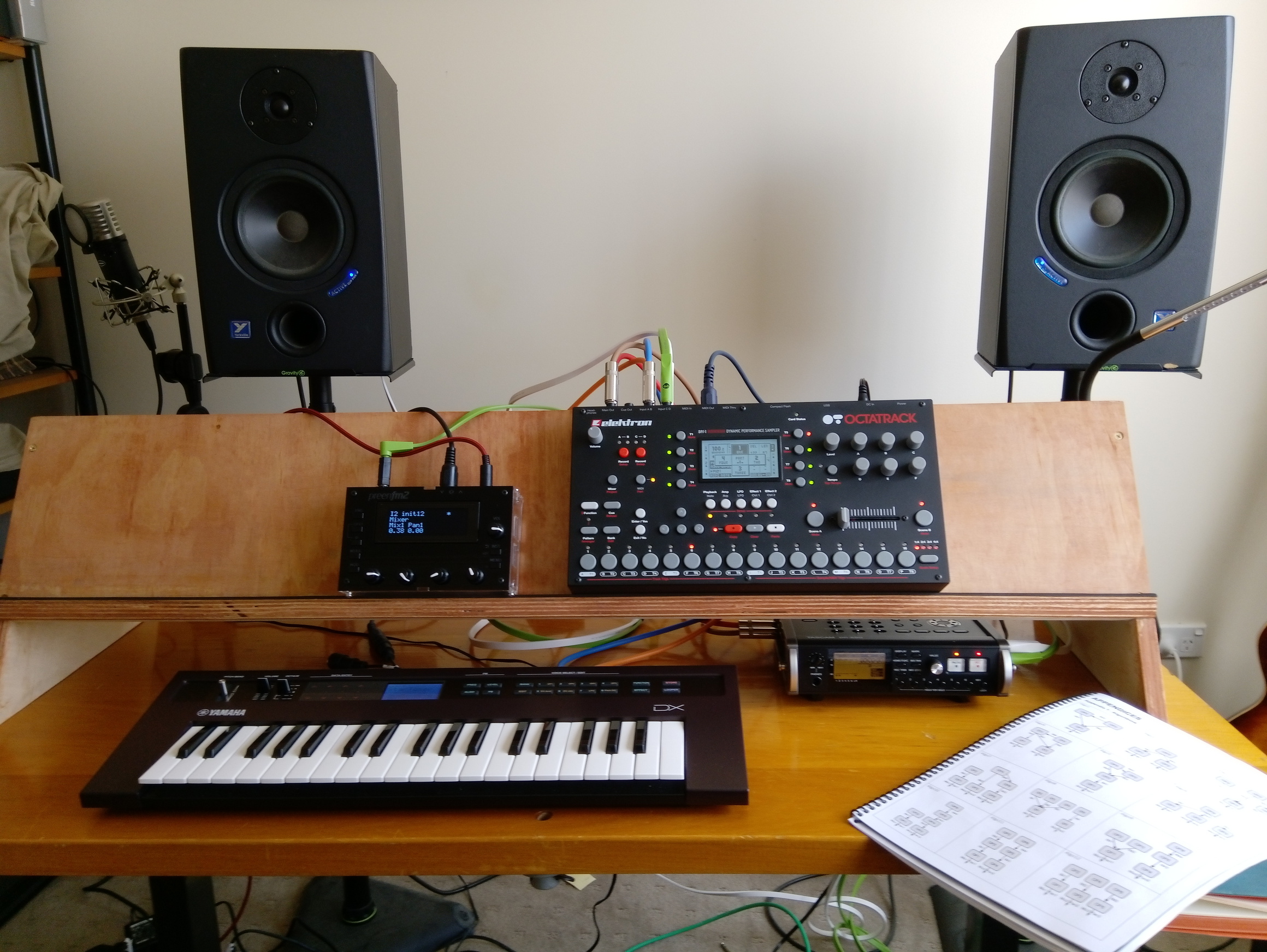 Took a while to get around to it. It’s nothing special technically or aesthetically, but is perfect for me. A friend with a bit of woodcutting know-how (and equipment) build a little desktop stand to plan. It fits exactly across my desk and holds modules perfectly at a good angle for easy access (no more hunching over!). The keyboards and Tascam recorder can slide in and out underneath.