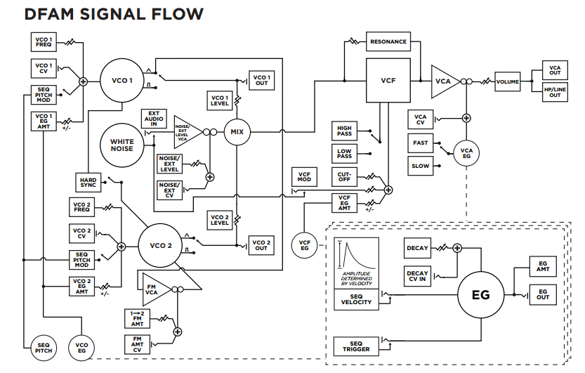 Keep in mind the DFAM uses 6 VCAs (maybe more?); 3 for velocity control of the 3 envelopes, 1 for FM amount, 1 for noise level, and 1 more for the final output. I don’t think the Neutron has velocity control over the envelopes which is a key part of the DFAM’s sound. Also the 12db filter on the Neutron will sound pretty different than the 24db ladder filter.