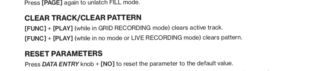 In REC mode, FUNC + CLEAR clears the current track (good, right), but when you are in Live REC mode (quantized or unquantized), FUNC + CLEAR clears the current Sequence/Patterns of everything, as if the DT is stopped and act on pattern level, not the current track only.