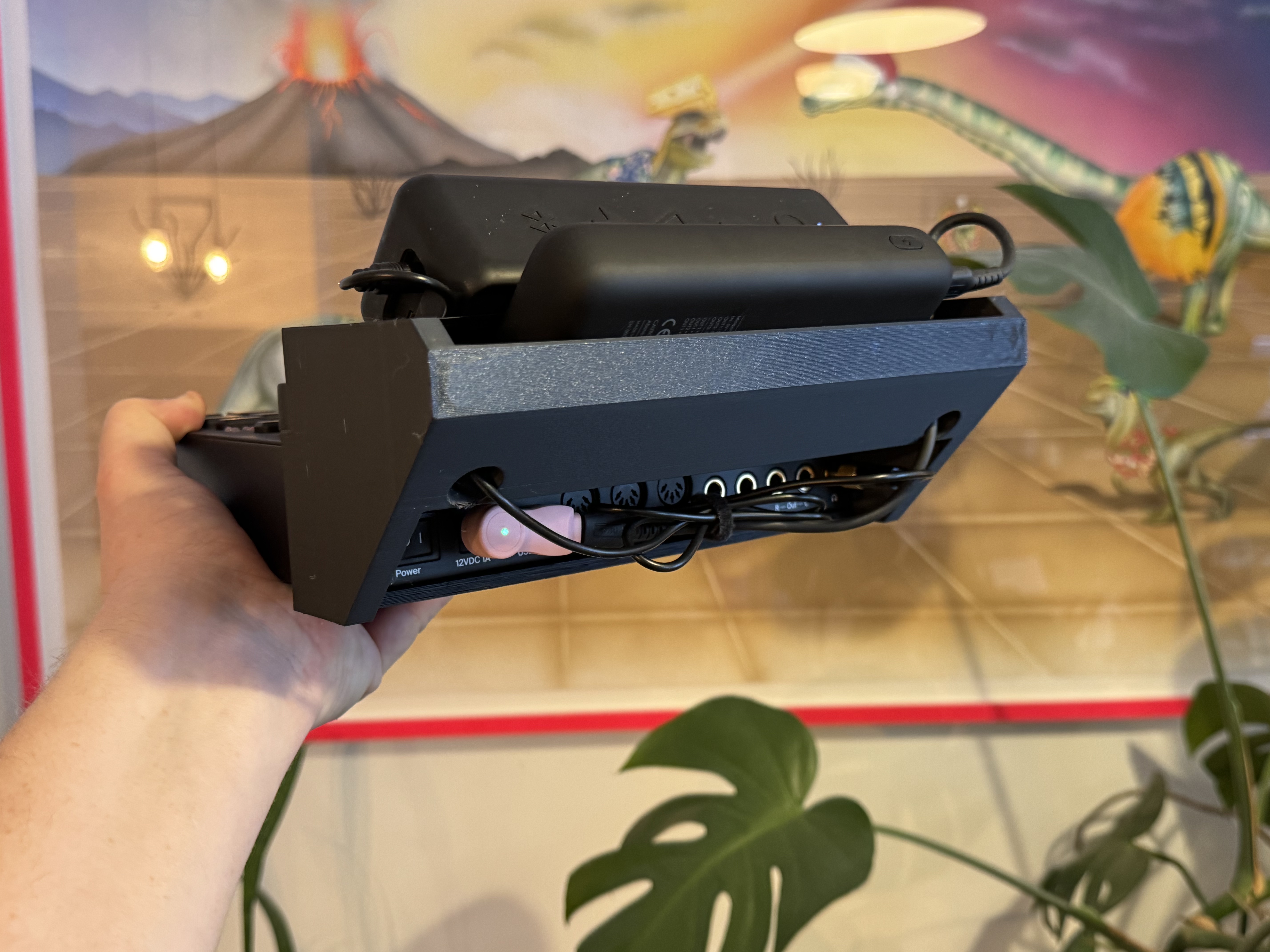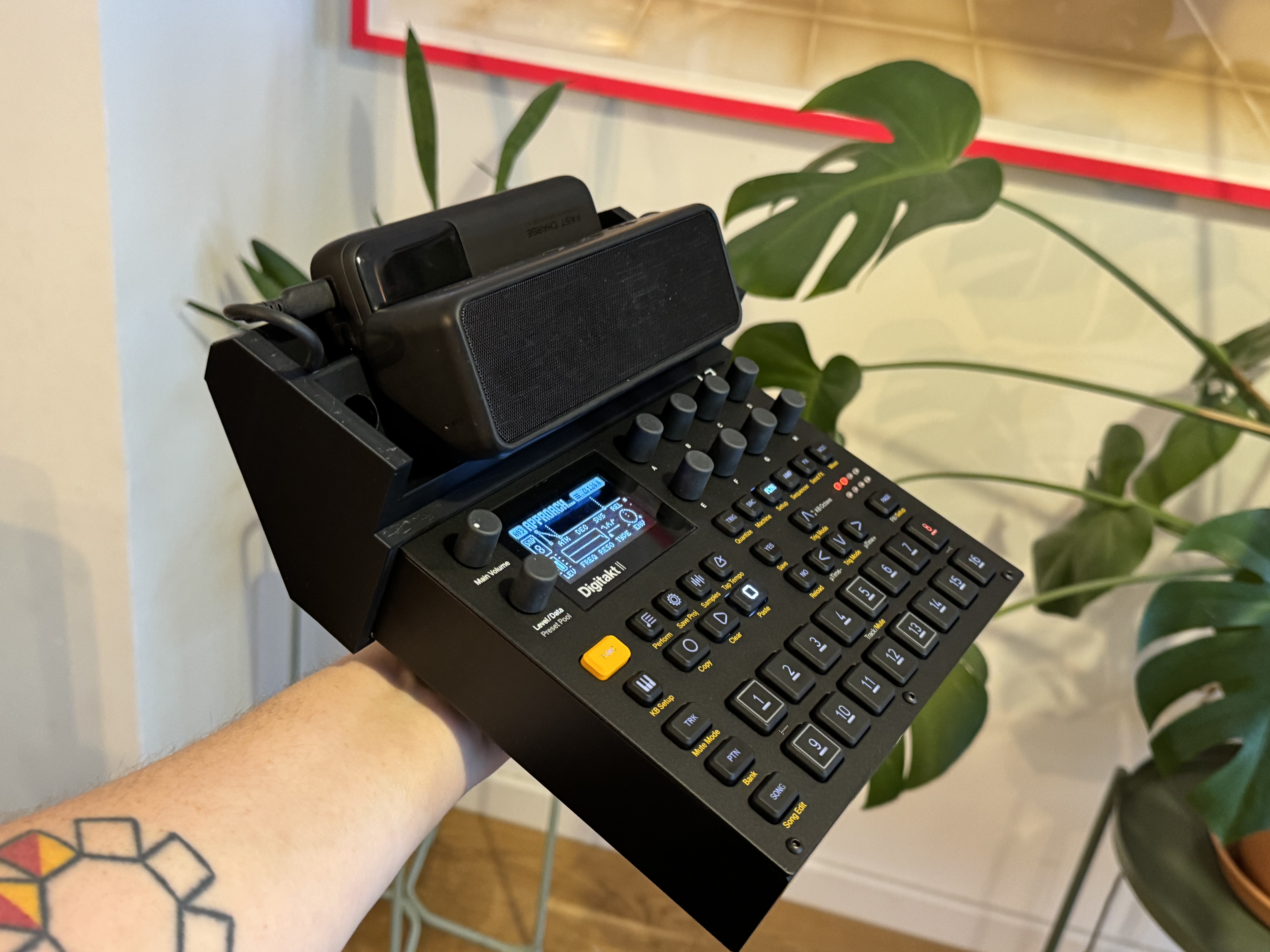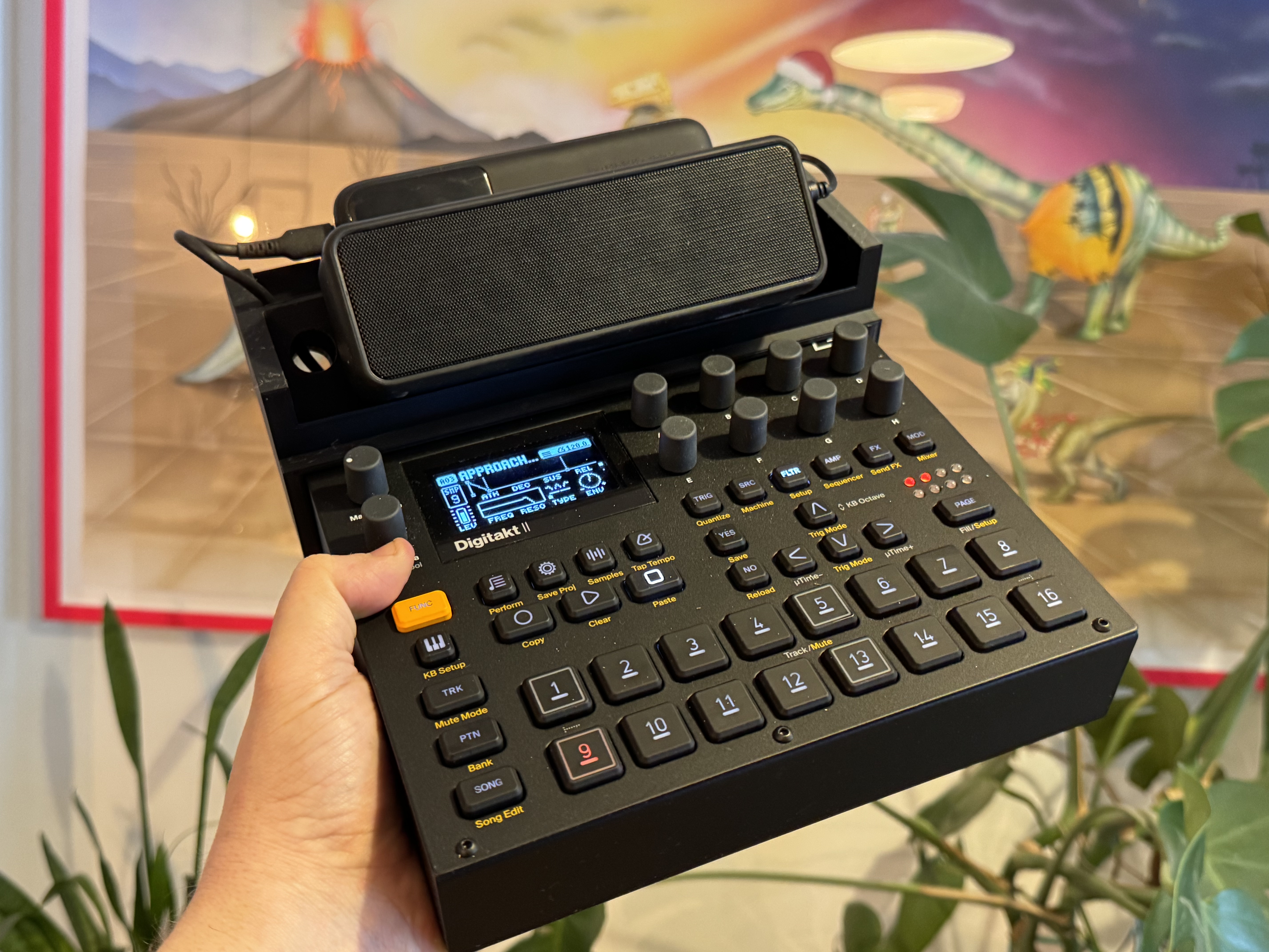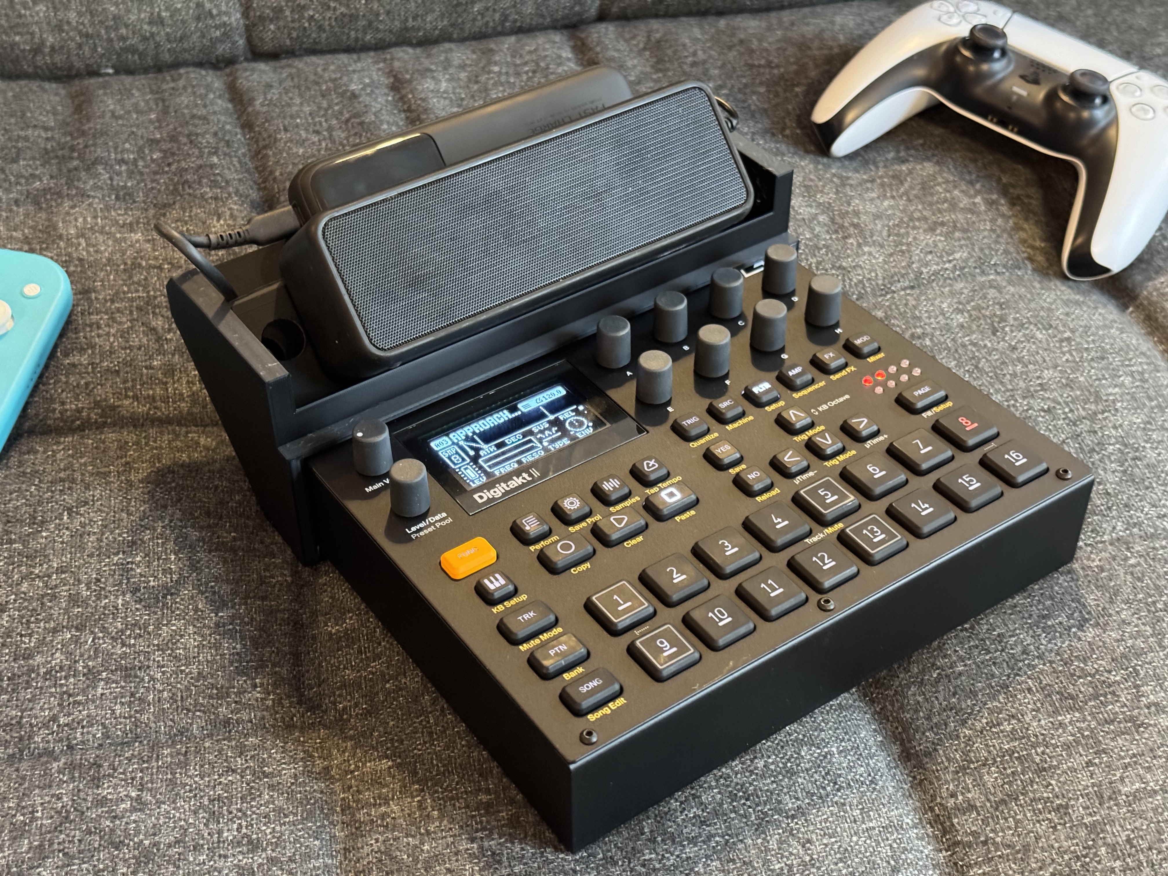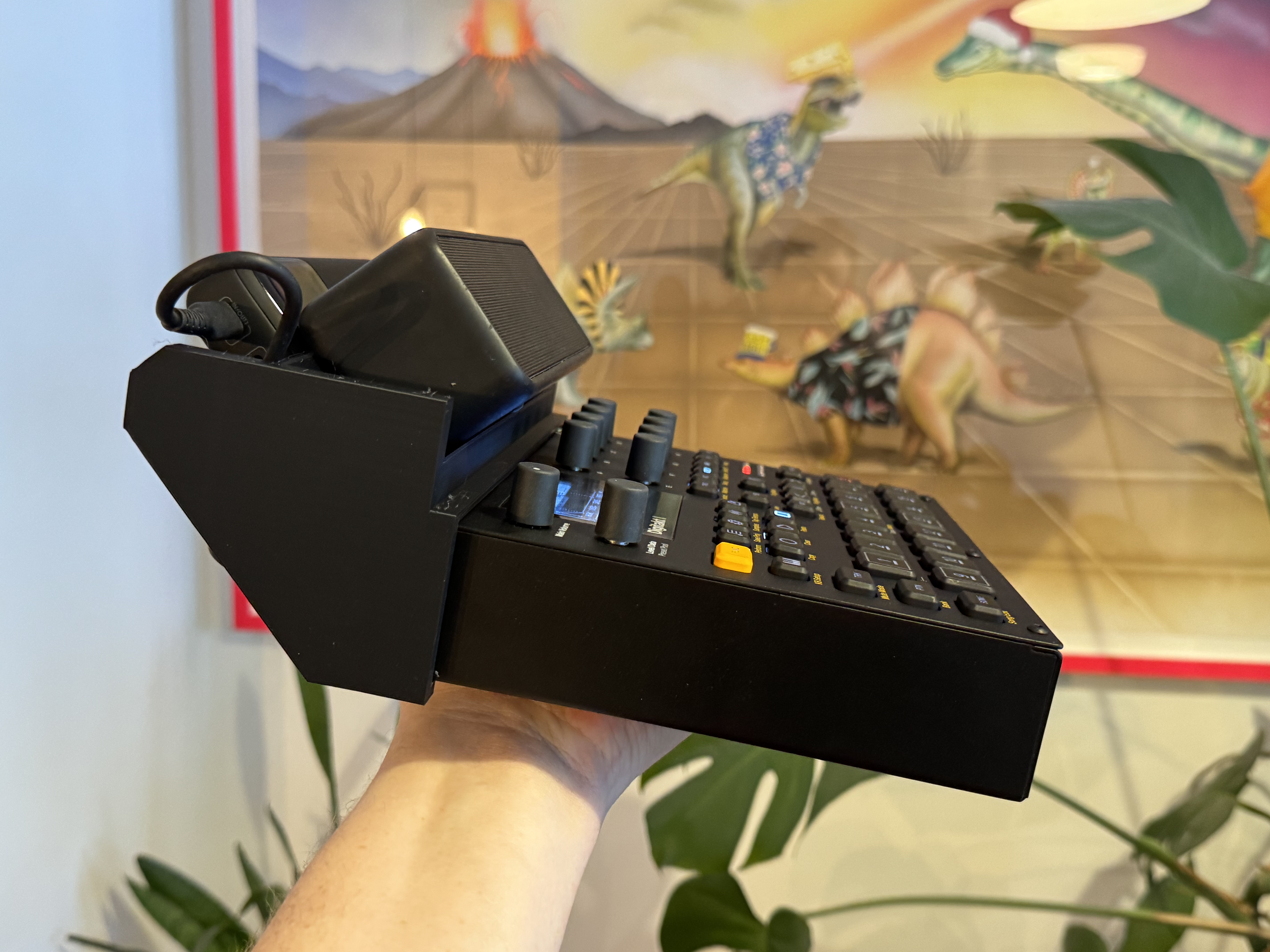 I wanted to add battery to my Digitakt but didn’t really want to mod it. And, I wanted to have speaker on it, so I could noodle on the couch without headphones. Here’s what I came up with, room for a battery pack and a space to rest a little speaker, and holes to route your cables. Add in a MyVolts and you’ve got an MPC Live, Elektron style.