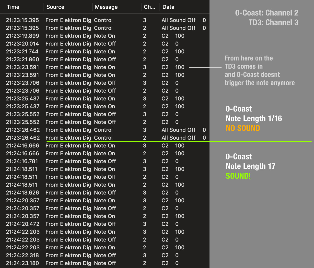 It looks like (from the midi monitor) for some reason channel 3 is always sent first, even the note off (velocity 0) appears for channel 3 first. I might try switching which device is on which channel and see if there’s any impact on the behavior. Basically testing the behavior of the 0 coast when it’s on ch3 and the td3 is on ch2.