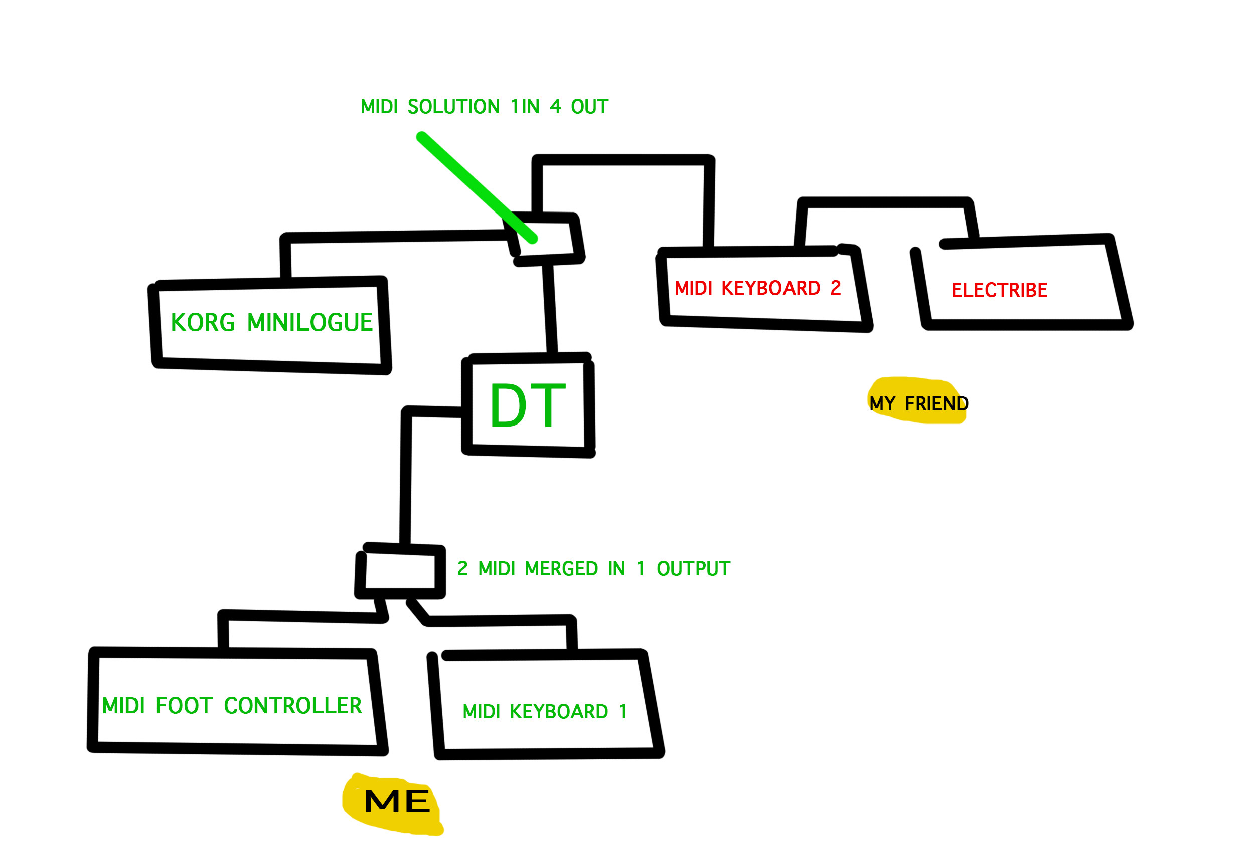 And u can avoid the midi solution box and use the two output of the DT(ie set the Midi Thru 2 as an out) unless the controllers(key1 and Footswitch) are also controlling the minilogue or/and the tribe