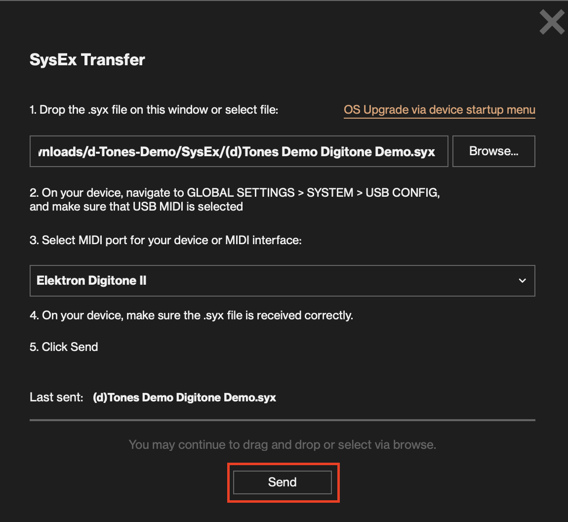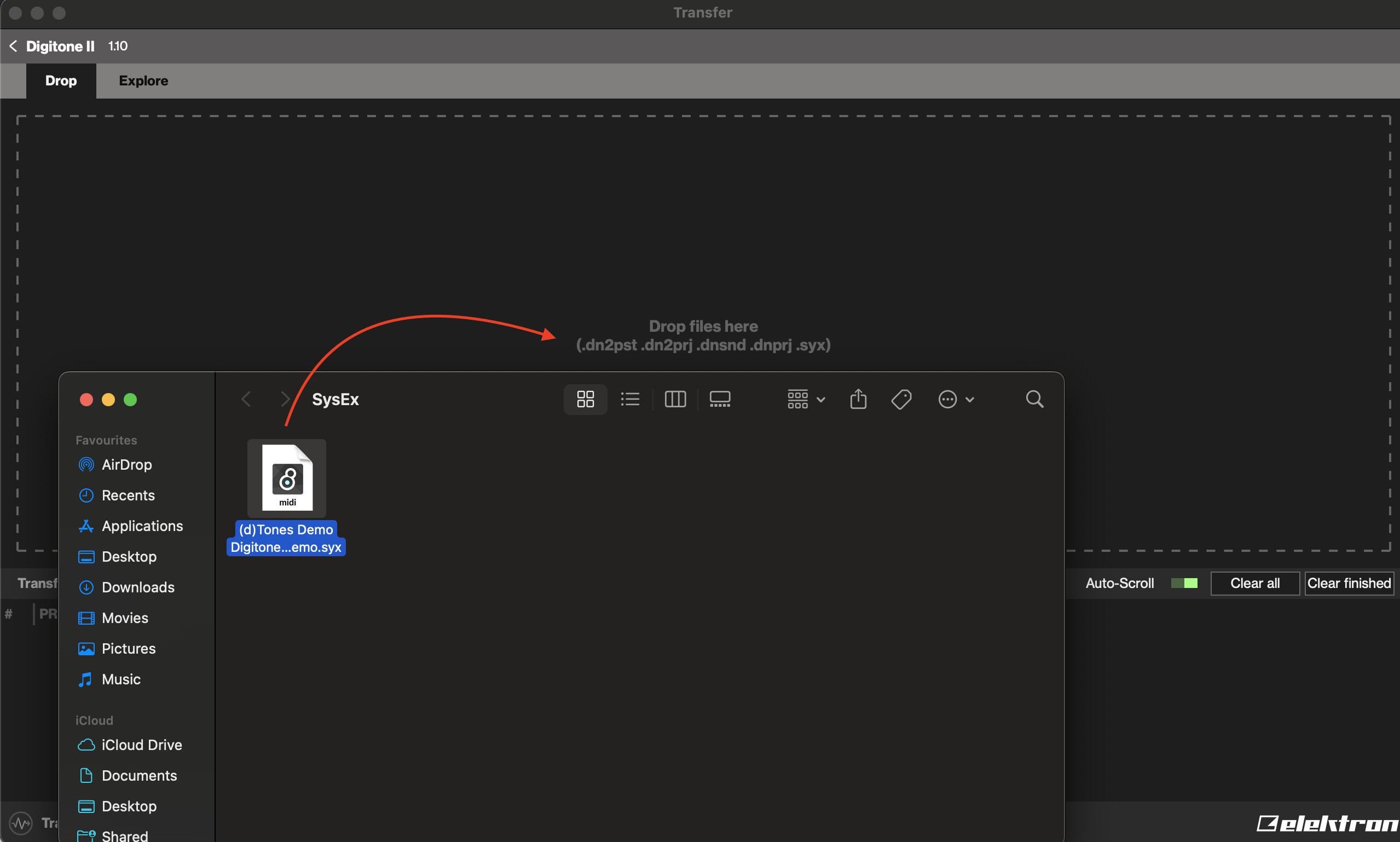 You can drag and drop, it will open a page in Transfer to send. On the Digitone II you go to SETTINGS > SYSEX DUMP > SYSEX RECEIVE and select the location. I just tested with several Digitone .syx files and had no issues.