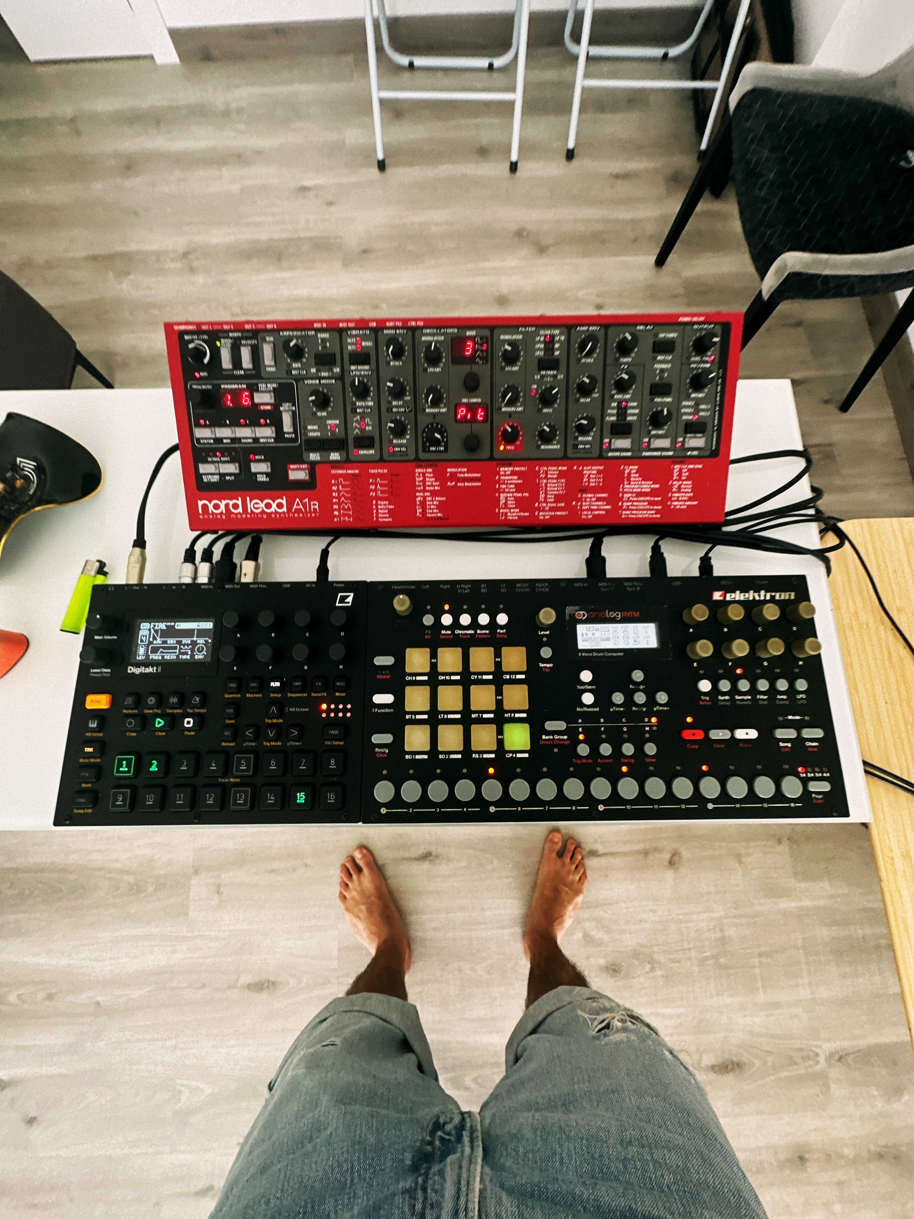My setup includes an Octatrack for long samples record like atmospheres, grooves and synth, a Rytm using drum samples and using the synth part, plus a modular system for the main synth parts.