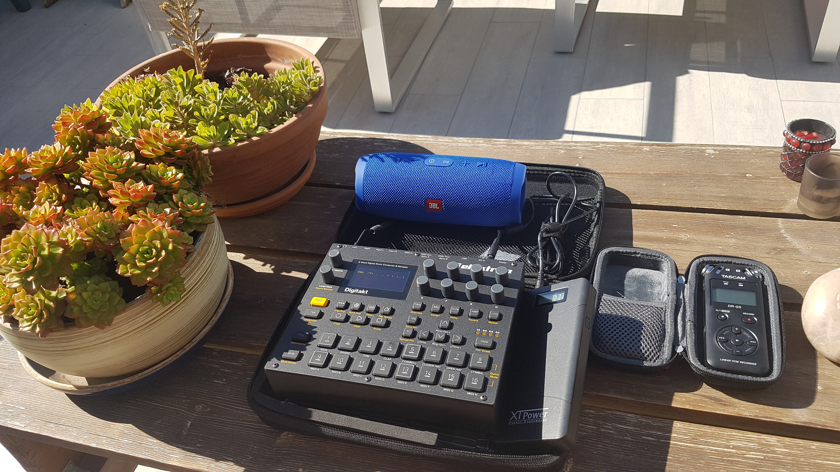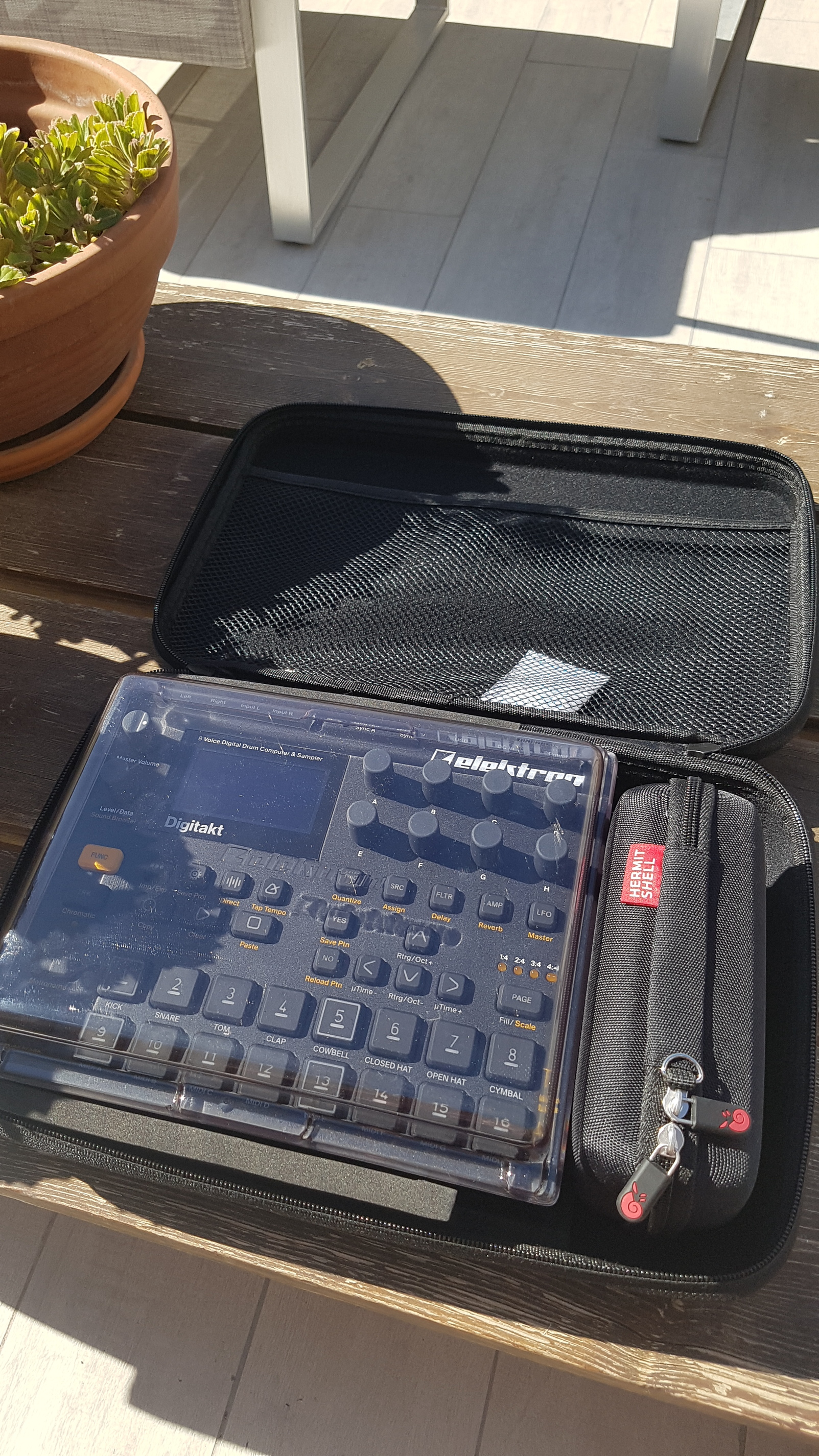 I use a similar setup but in a shoulder bag normally used for photography I think. The shoulder bag is sort of a softcase on the inside, so the DT can go in without additional protection. Then I have a small rectangular case where the battery fits in + the rx100 camera + the gorillapod. The headphone goes on top and the tripod underneath the lid of the back to keep it secure. This is what I take with me: