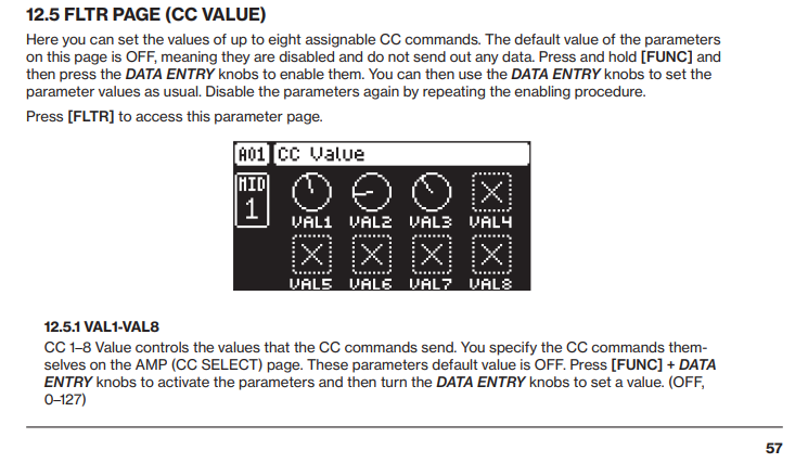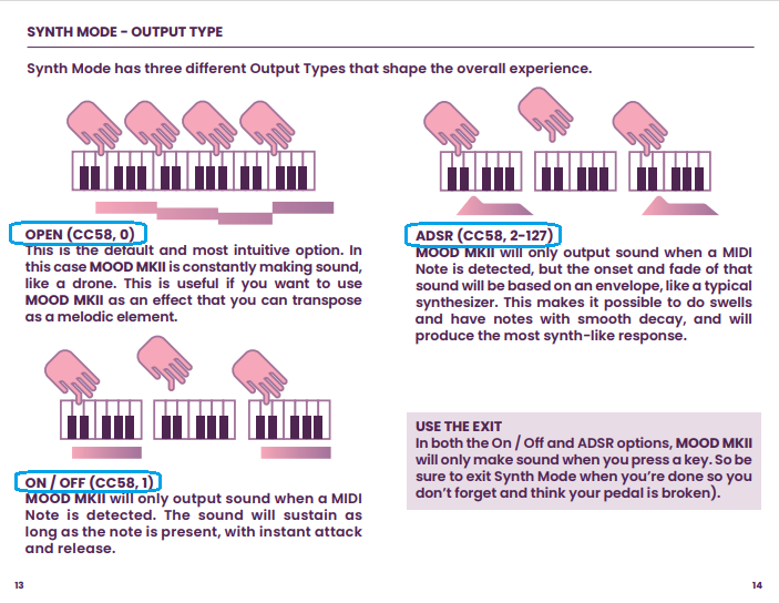 In synth mode, I’m not clear on whether it’s showing CC’s as pairs or if it’s saying cc 58 with a value of 0 yields open, cc 58 with a value of 1 yields closed, and cc 58 with a value of 2-127 yields adsr mode, but my assumption is the latter and that by sending the correct cc with one of these values you can access the corresponding synth mode.