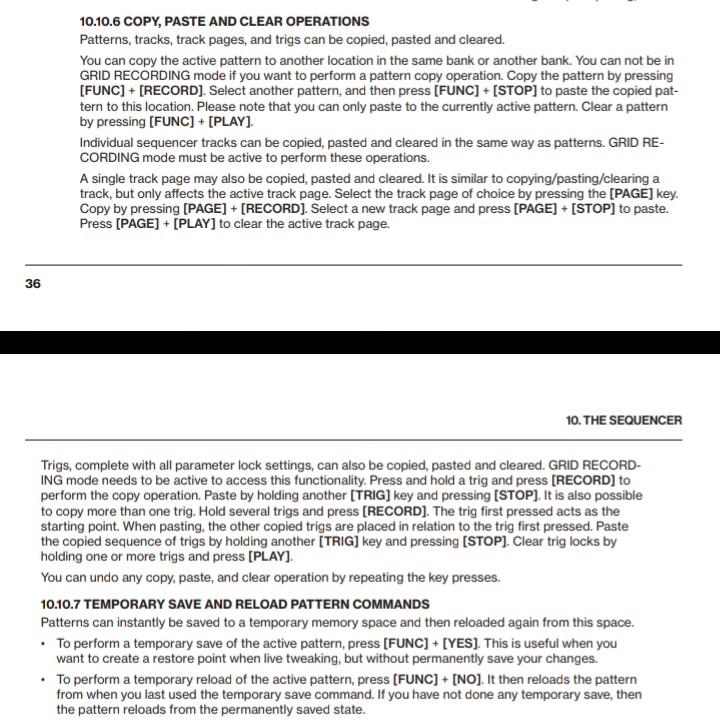 Patterns, tracks, track pages, and trigs can be copied, pasted and cleared.