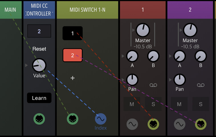 On the Main track I use a MIDI CC controller module which routes CC2 to the index parameter of the MIDI switch module. The output 1 of the switch is routed into input of track 1, output 2 goes to track 2. But it looks like the MIDI track input routing is completely ignored. There are the MIDI input options “always” and “active track” (default) but they don’t help. I also tried to change the MIDI input from “any” to “Drambo” but then no MIDI is passed to that track anymore.