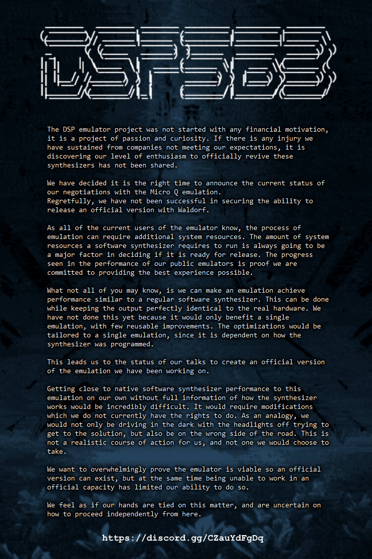 Theyāve already got one of the Waldorf synths working enough (Micro Q) to where they actually brought it to Waldorf and let them use it in an attempt to do an official collaboration. Unfortunately, Waldorf wasnāt happy enough with the resource usage compared to a native VST synth, but itās not apples to apples either. Waldorf could help them optimize it quite a bit by giving them insight on where to concentrate their efforts in the emulator, because they could have access to the source code. Right now, theyāre completely blind and just making best effort guesses, so itās not as optimized as it could be.
