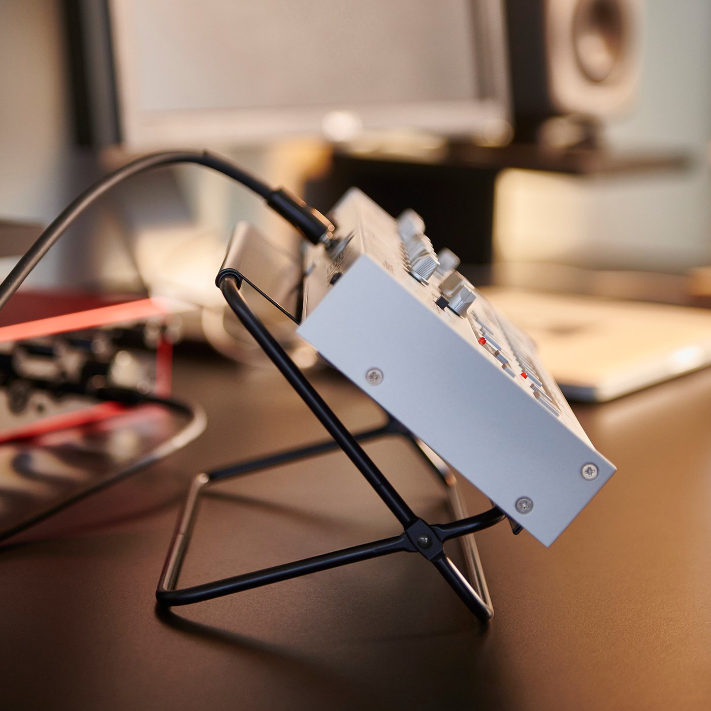 The stand is a bit more upright than some other stands. It also holds my Syntakt a little bit raised up. The angle and height work well for me compared to other cheap~ish stands.