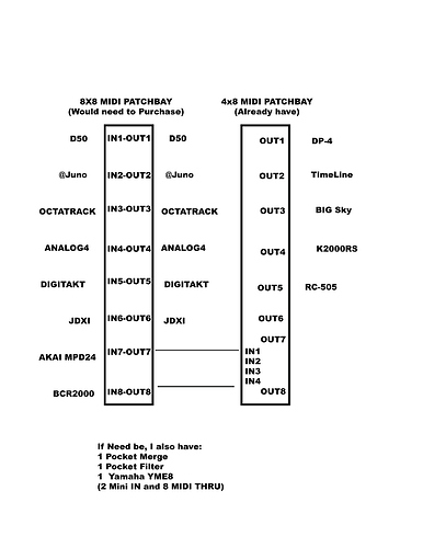 I currently only have a 4x8 Midi patch bay. I am wondering if I were to add everything to an 8x8 MIDI patch bay, and had two cables hooked up to the other patch bay, could I get them all to play along?