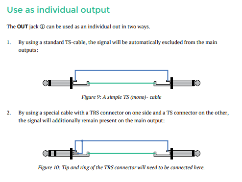 Edit: also, there is quite a bit of volume loss on the main out version that way so it seems. But if you click the plug out of the socket as you can do with most jack in/outs this is solved and you still het both outs. This is probably because it’s not using the tip I think.