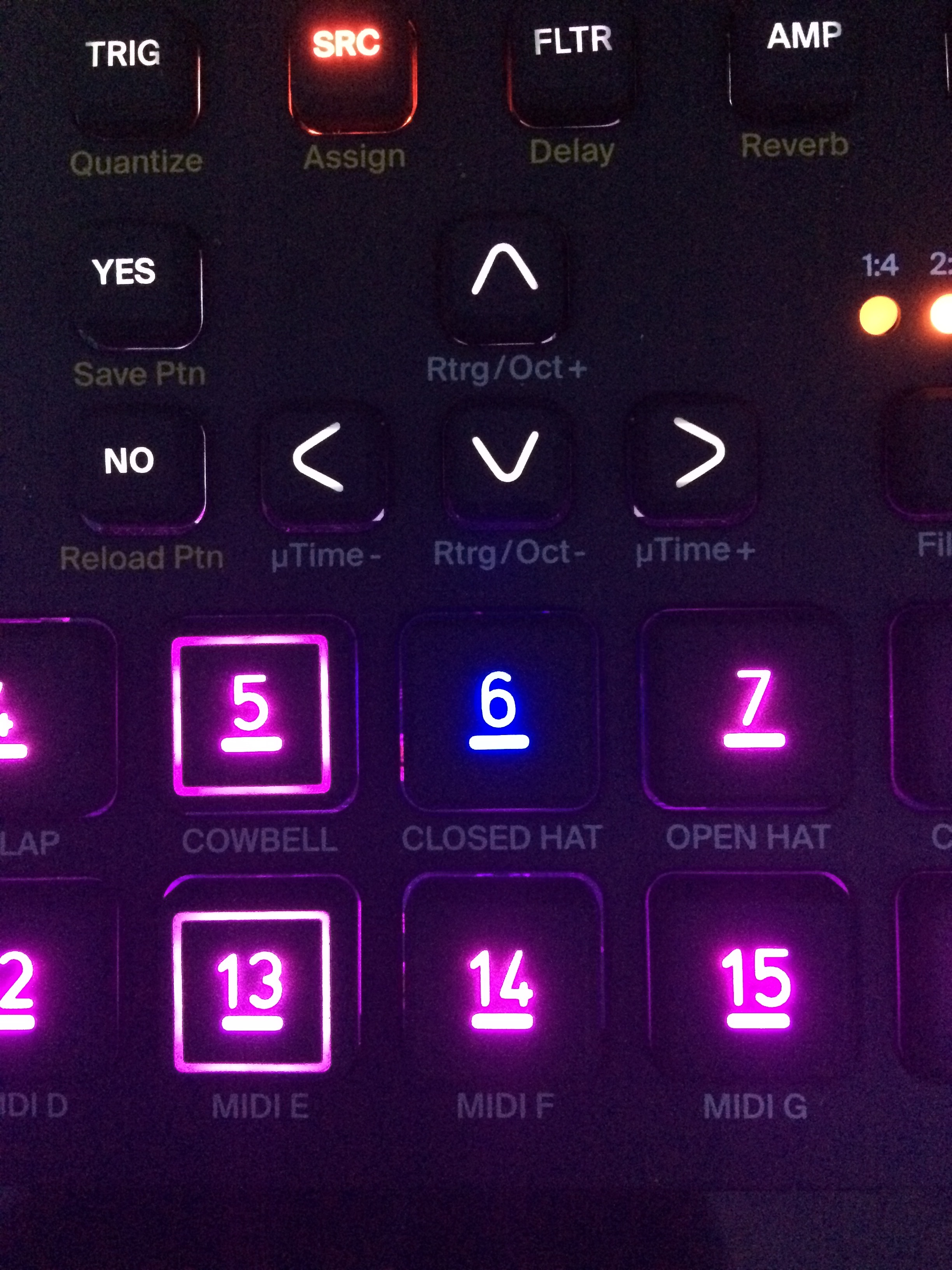 Have had my digitakt since June. One of my trig button leds is faulty. Glows the wrong colour in every mode. Machine starts ok but after about 10 minutes it starts. Blue in Pattern Mute seen above, Pink when a trig is placed, Pink Track Mute, OFF on the pattern page and worst of all RED when set as a trigless lock! I could deal with all of them except the last. RED instead of YELLOW as trigless lock is a total show stopper.