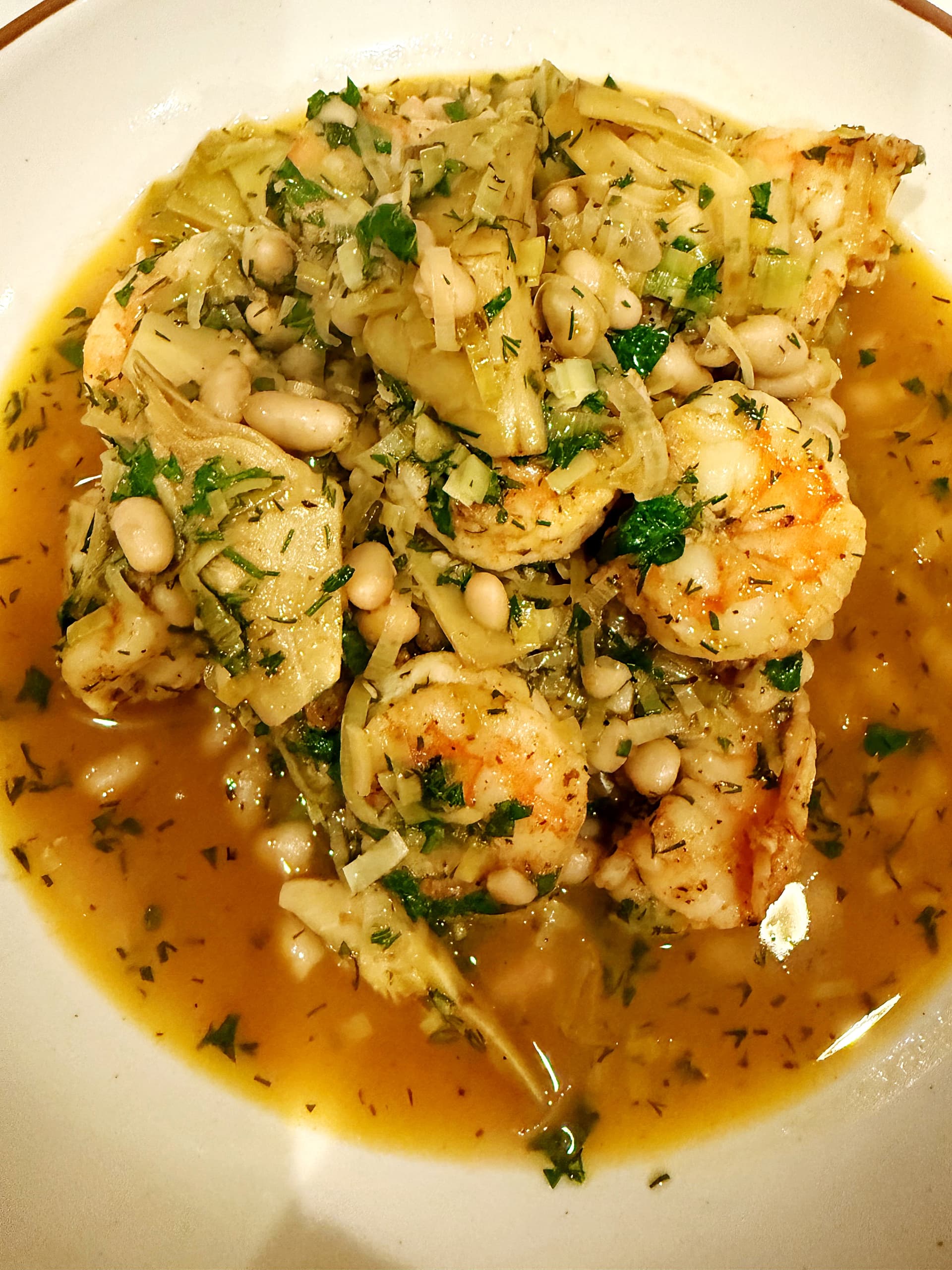 I made some brothy shrimp situation tonight with navy beans, leeks, artichokes, lemon, and lots of parsley and dill. I dunked a crusty baguette in the there and it was good.