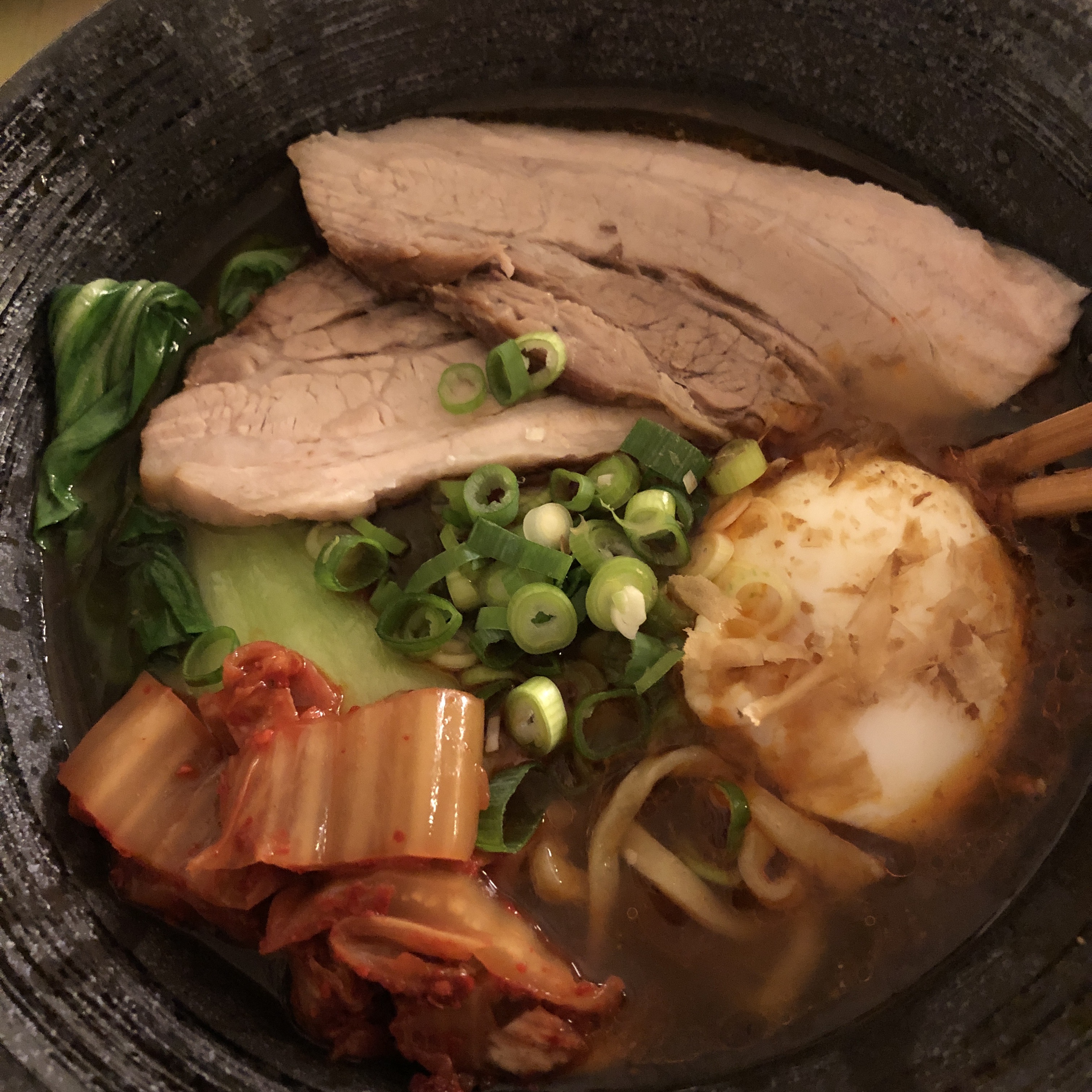 Starting to get a hang on this ramen business. Best yet but the last one was prettier. Straight chickenbroth with sichuan tare. Alot better flow so I even had time to chill the pig to slice it thinner. Tasted really pro. Alkaline noodles was better also.
