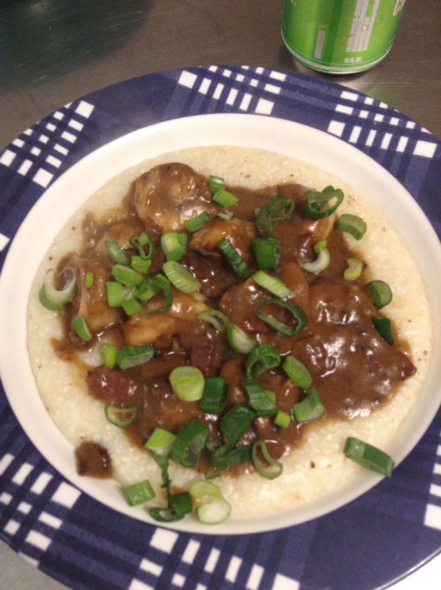 Throw in the shrimp (about 1 pound, cooked in a separate pan with butter). Stir it all up and serve over grits. Garnish with green onions and a bit of extra bacon that was cooked in the oven.