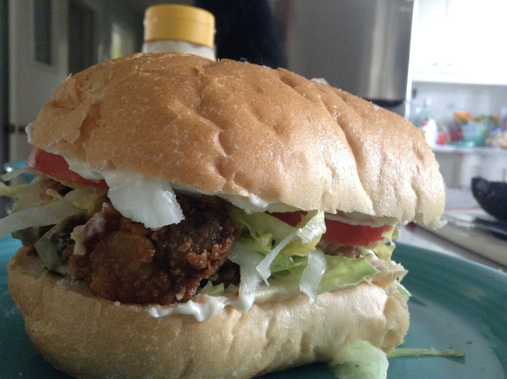Made a fried oyster Po Boy sandwich with leftover fried oysters from previous day’s lunch at the local dive bar. Nice Italian bread, lot’s of Duke’s mayo @micabeza, chopped iceberg lettuce, hothouse tomato, hot sauce, kosher salt, and of course fried oysters. Pretty damn good.