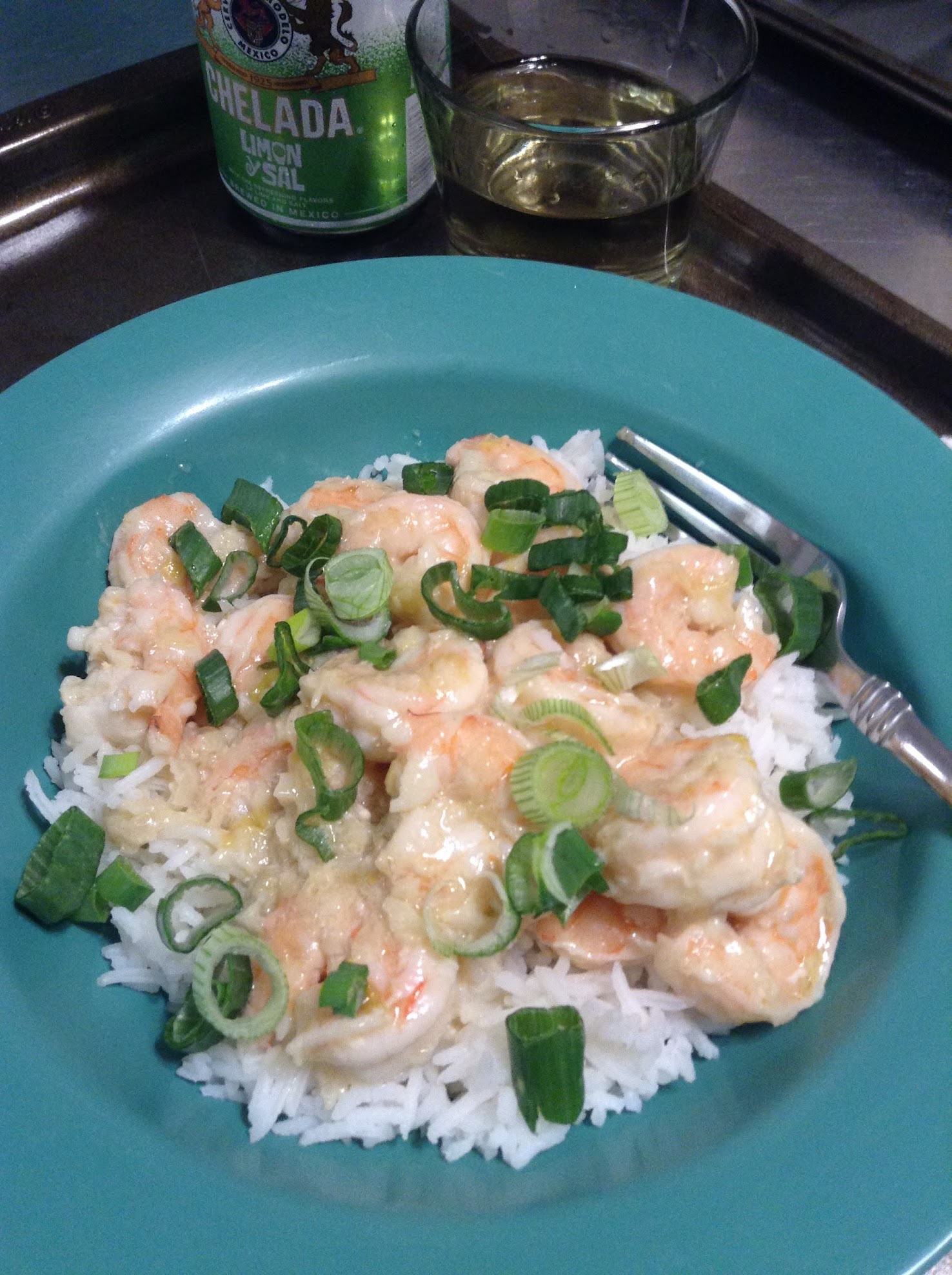 Put a bunch of butter (maybe 7-8 tbsp’s) and a couple tbsp’s of olive oil in the skillet. Add zest of 1-2 lemons, lemon juice (about 2-3 tbsp’s worth), chopped onion (white part of 4 green onions), plenty of fresh garlic (maybe 6-7 large cloves worth), salt. Once that’s all looking good, throw in the shrimp (roughly 1 pound) for a couple minutes. Serve over rice. Garnish with green onion. Quick, easy, and delicious. Might add a bit of white wine to the sauce next time.